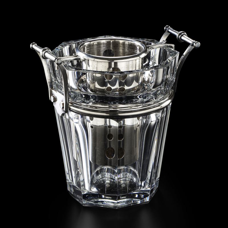 Simbolo d’eleganza, lo champagne trova la sua migliore cornice in questo lussuoso secchiello in cristallo sfaccettato, arricchito da due manici e da un porta bottiglie in metallo argentato