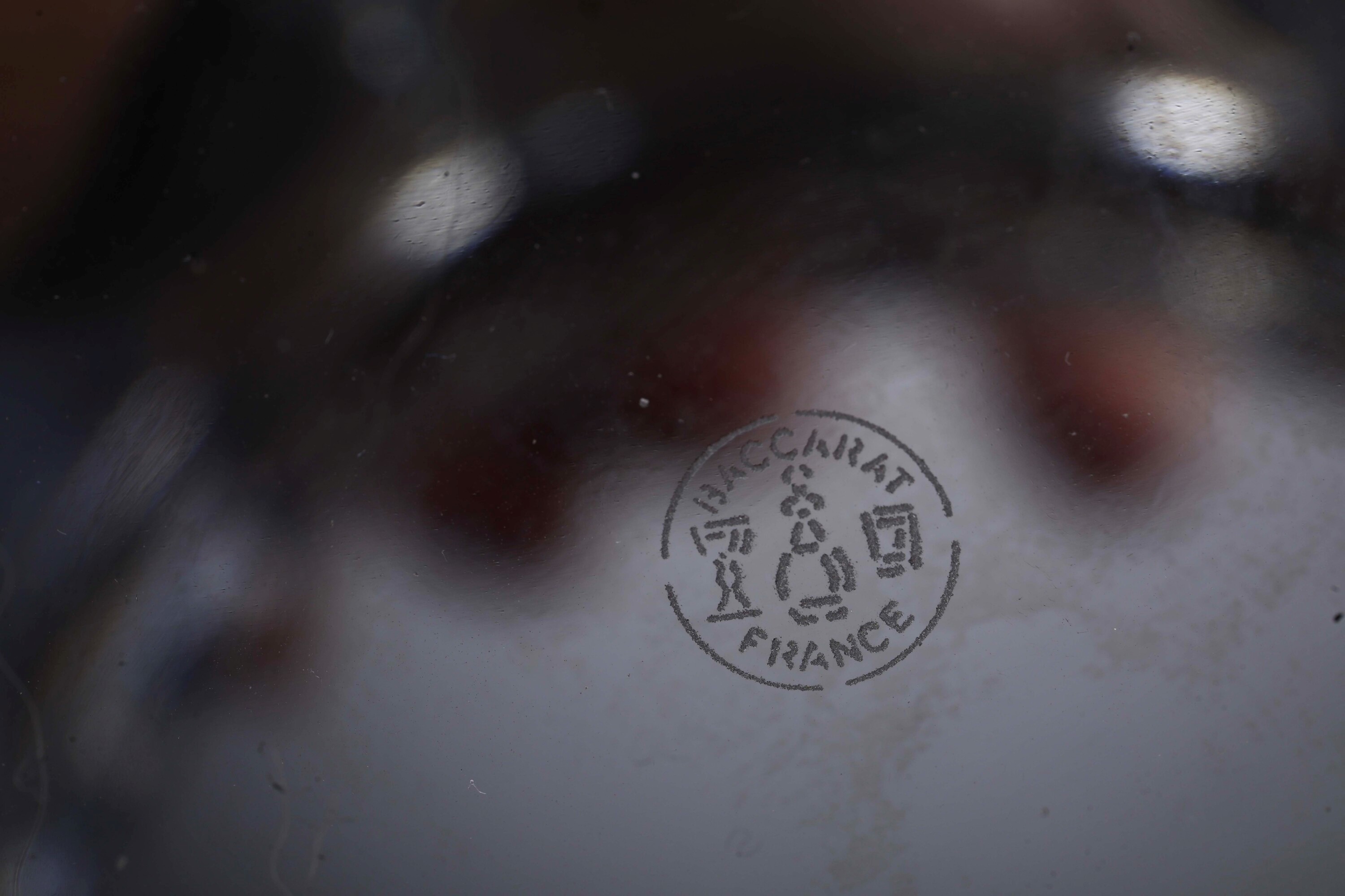 Cristallo e metallo argentato. Marca: simbolo grafico della manifattura "Baccarat France" inciso all’acido sotto la base; Baccarat inciso sul bordo inferiore. Dimensioni: altezza massima cm 25; diametro massimo cm 25. Conservazione: ottima