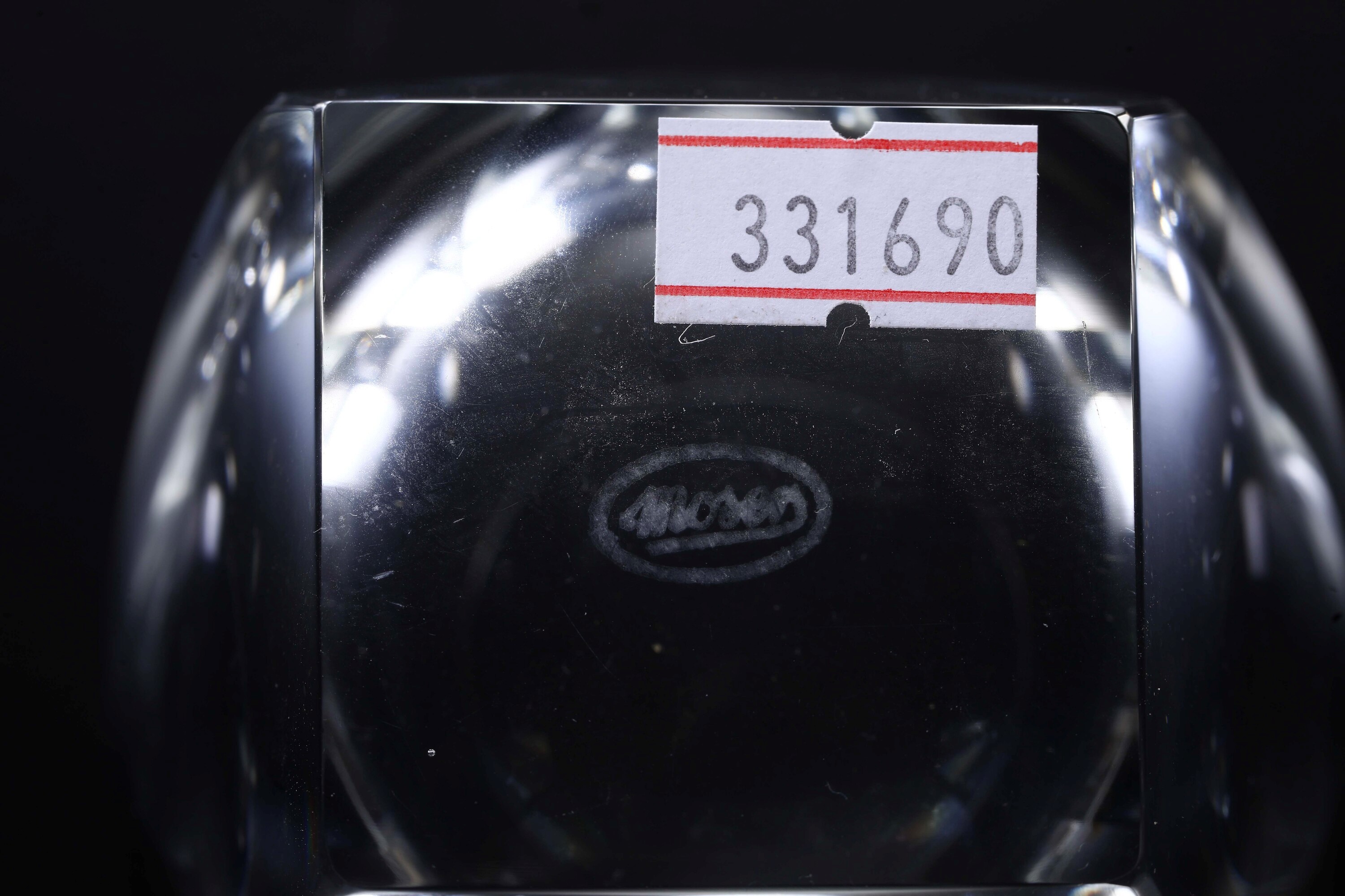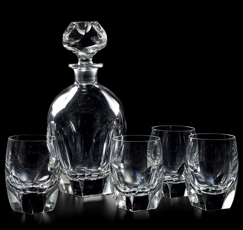 Cristallo. Marca: “Moser” inciso all’acido. Dimensioni: altezza bicchieri cm 11; bottiglia cm 28. Conservazione: ottima