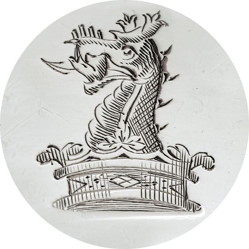 Bordo sagomato con decoro a baccellatura e crest raffigurante testa di drago poggiante su corona finemente cesellato