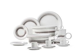 Il servizio per 12 persone conta 54 pezzi ed è così composto: 12 piatti fondi (diametro cm 18); 12 piatti piani (diametro cm 27); 12 piatti da dessert (diametro cm 20); 2 ciotole (altezze cm 12; cm 11; diametro cm 34; cm 29); 1 piatto da portata tondo (diametro cm 38); 12 tazze da caffè con piattino (altezza tazza cm 7; diametro piattino cm 13,5); 1 caffettiera (altezza cm 22); 1 lattiera (altezza cm 7); 1 zuccheriera (altezza cm 11)