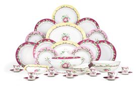 Il servizio per 10 persone più riserve, conta 66 pezzi ed è così composto: 11 piatti fondi (diametro cm 23); 25 piatti piani (diametro cm 27); 12 piatti da dessert (diametro cm 22); 1 zuppiera (altezza cm 22; cm 32x19); 1 insalatiera (altezza cm 9; diametro cm 26); 1 salsiera; 1 piatto da portata tondo (diametro cm 30); 2 piatti da portata ovali (cm 38x24; cm 32x29); 2 vassoietti ovali (cm 23x12); 12 tazze da caffè con 10 piattini (altezza tazza cm 5; diametro piattino cm 12)
