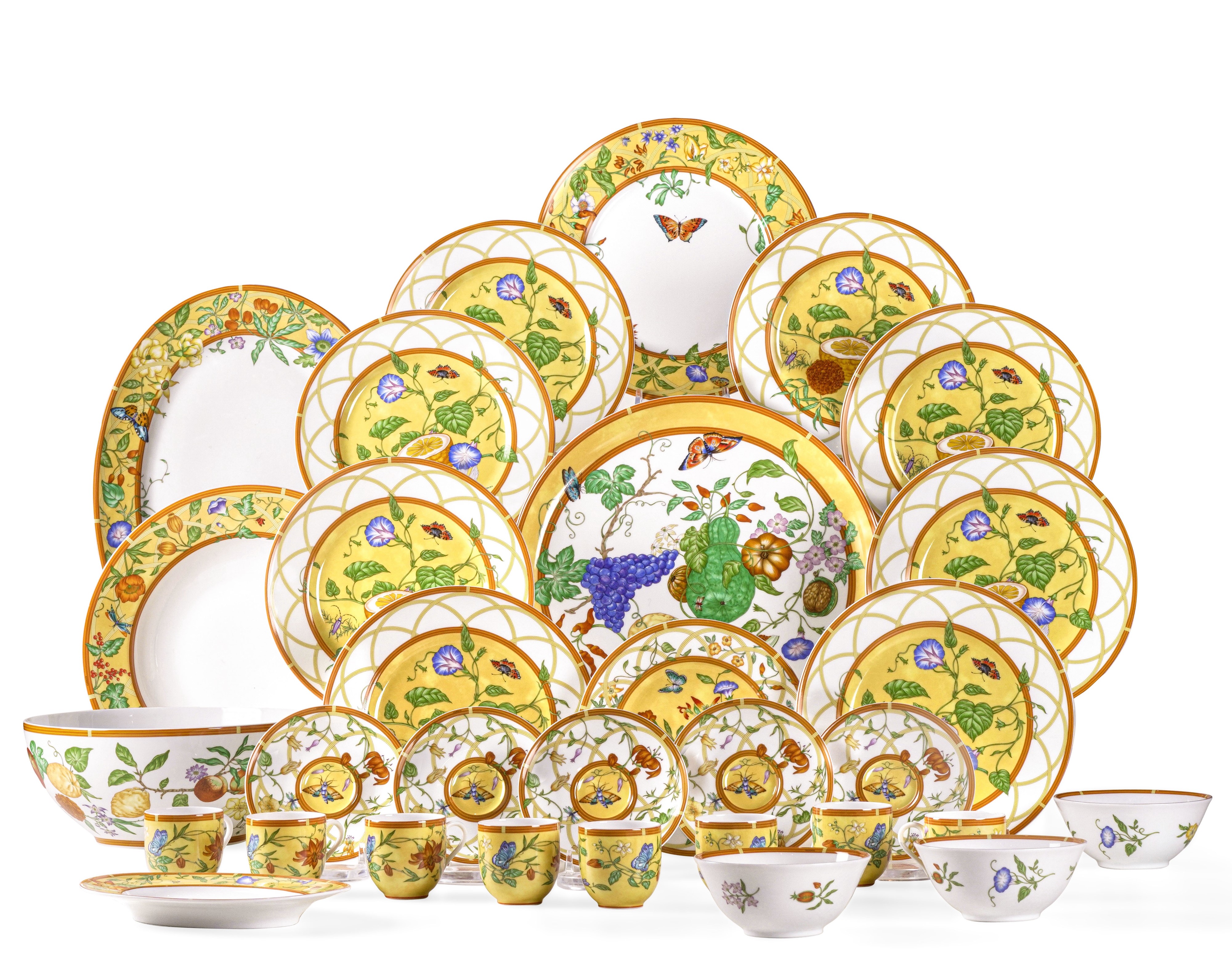 Il servizio "La Siesta" di Hermès è decorato con un motivo che ci immerge nell'affascinante bellezza di un giardino esotico, dove fiori, frutti, uccelli e farfalle danzano tra arabeschi su un fondo giallo, creando un'atmosfera estiva gioiosa