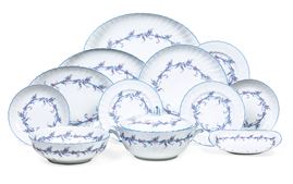 Il servizio per 12 persone conta 54 pezzi ed è così composto: 12 piatti fondi (diametro cm 21); 24 piatti piani (diametro cm 24,5); 12 piatti da dessert (diametro cm 21,5); 1 zuppiera (altezza cm 17; diametro cm 32); 1 insalatiera (altezza cm 7,5; diametro cm 24,5); 1 piatto da portata tondo (diametro cm 33); 3 piatti da portata ovali (cm 43,5x34; cm 38x29; cm 33x25)