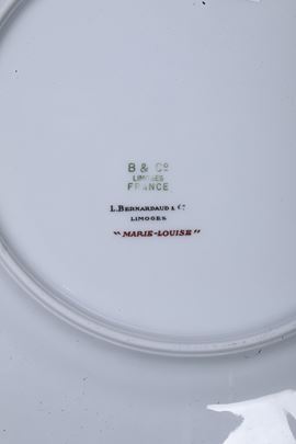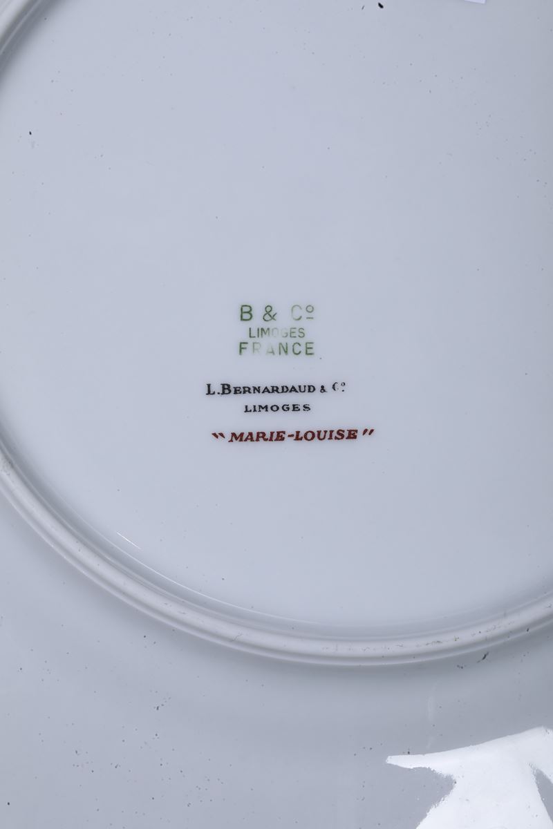 Porcellana. Marca: “B&C° Limoges France” e “L.Bernardaud & C°.”. Conservazione: ottima; un piatto da dessert con felatura e una piccola sbeccatura su un vassoietto ovale
