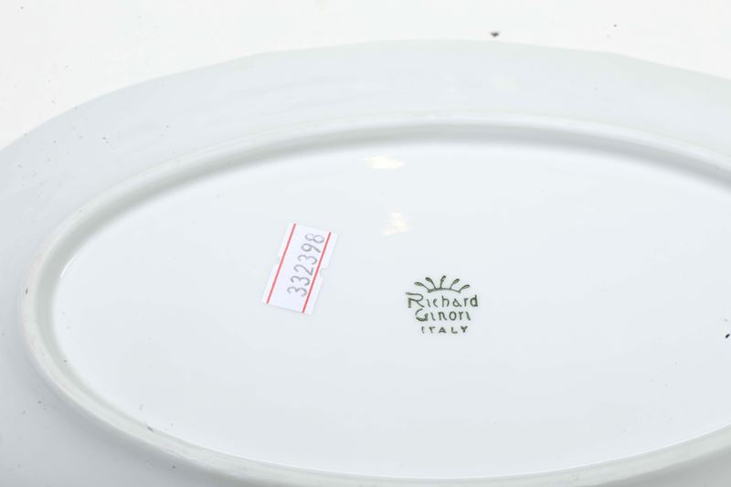Porcellana. Marca: "Richard Ginori" con corona in verde. Conservazione: 1 piatto fondo con piccola sbeccatura incollata; 1 tazza da caffè con insignificante sbeccatura su un manico