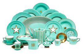 Il servizio, disegnato da Claudio La Viola, ha un carattere moderno e accattivante e presenta decorazioni dorate su fondo turchese, un sublime mix di classico, moderno e art déco