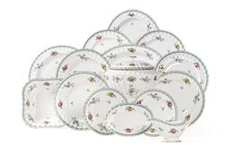 Il servizio per 12 persone conta 56 pezzi ed è così composto: 12 piatti fondi (diametro cm 23); 24 piatti piani (diametro cm 27,5); 12 piatti da dessert (diametro cm 21); 1 zuppiera (altezza cm 24; diametro cm 29); 1 insalatiera (altezza cm 6; cm 20x20); 1 salsiera; 1 piatto da portata tondo (diametro cm 32); 2 piatti da portata ovali (cm 42x31,5; cm 37x28,5); 2 vassoietti ovali (cm 21,5x14)