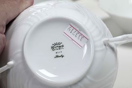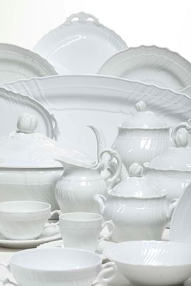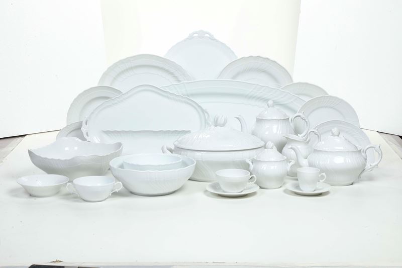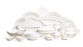 Il servizio per 12 persone conta 113 pezzi: 12 piatti fondi (diametro cm 24); 12 piatti piani (diametro cm 24,5); 12 piatti da dessert (cm 21,5); 12 piatti da insalata a forma di mezzaluna (cm 22x13,5); 12 tazze da brodo (altezza tazza cm 6); 12 ciotoline (altezza cm 4,5; diametro cm 14); 1 zuppiera (altezza cm 22; cm 35x23); 1 insalatiera (altezza cm 9; cm 25x25); 2 ciotole (altezza cm 8,5 e cm 8; diametro cm 26 e cm 18); 1 piatto da portata tondo (diametro cm 31); 1 piatto da portata ovale (cm 34x24,5); 1 piatto ovale per pesce (cm 66x27); 1 vassoietto rettangolare (cm 29x12); 1 vassoietto ovale (cm 23x13); 1 vassoio tondo con manici (diametro cm 34,5); 1 vassoio ovale con manici (cm 42x26); 12 tazze da caffè con piattino (altezza tazza cm 7; diametro piattino cm 13); 1 caffettiera (altezza cm 22); 1 lattiera (altezza cm 12); 1 zuccheriera (altezza cm 12); 12 tazze da tè con piattino (altezza tazza cm 6; diametro piattino cm 15); 1 teiera (altezza cm 15); 1 lattiera (altezza cm 11); 1 zuccheriera (altezza cm 12)