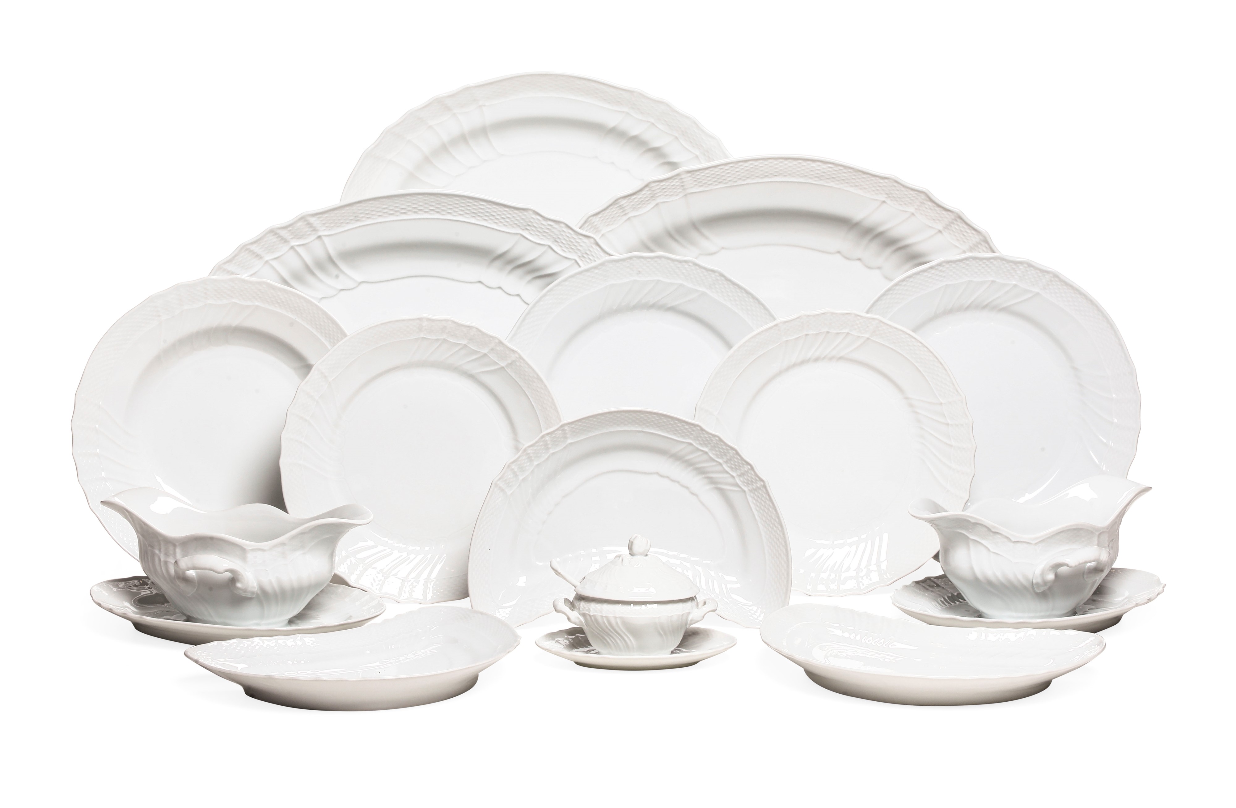 Il servizio per 20 persone più riserve, conta 124 pezzi ed è così composto: 22 piatti fondi (diametro cm 23,5); 47 piatti piani (diametro cm 23); 42 piatti da dessert e antipasto (diametro cm 21,5); 4 piatti da insalata a forma di mezzaluna (cm 23,5x13,5); 3 salsiere; 2 mostardiere; 4 piatti da portata ovali (cm 42x30; cm 41x29,4; cm 40x27; cm 33,5x25)