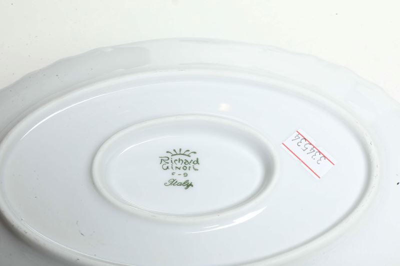 Porcellana. Marca: “Richard Ginori Italy” con corona in verde. Conservazione: tre piatti da dessert; un piatto piano; una salsiera; una mostardiera con sbeccature; il lotto si compone di pezzi dello stesso modello eseguiti in epoche diverse