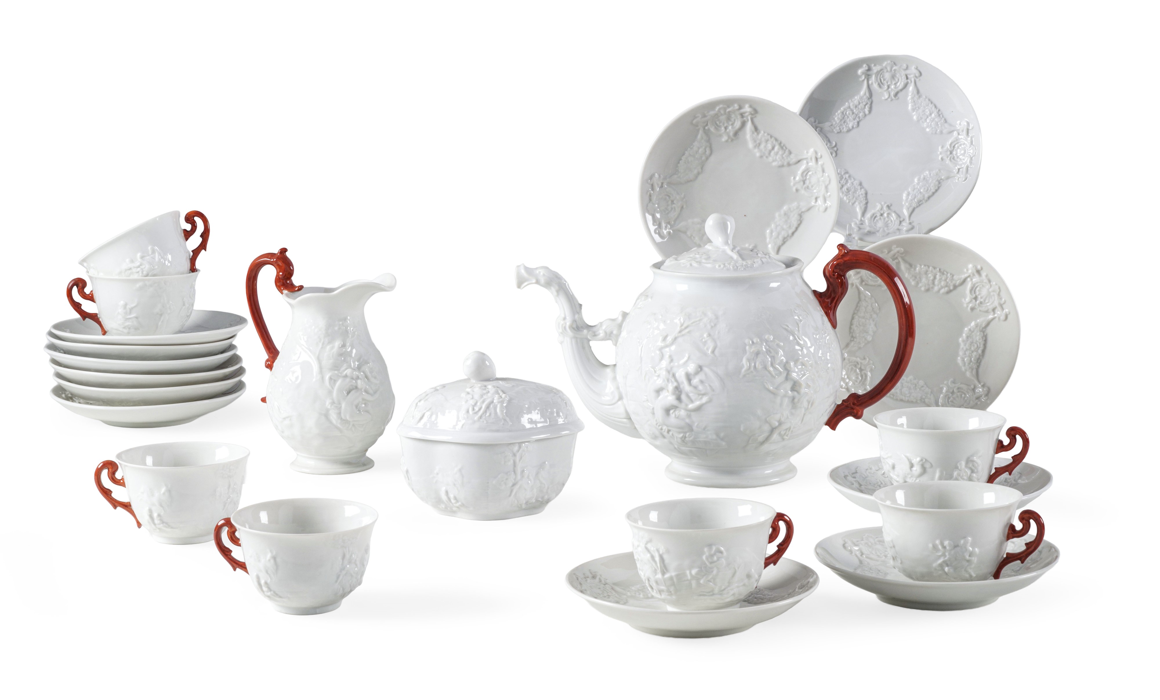 Il modello di questo elegante servizio, decorato a bassorilievo con scene mitologiche, riprende uno dei primi motivi utilizzati dalla manifattura di Doccia, fondata nel 1737 dal marchese Carlo Ginori. Questa tipologia decorativa, infatti, risale agli anni Quaranta del Settecento e diviene la più tipica, famosa e conosciuta della fabbrica toscana