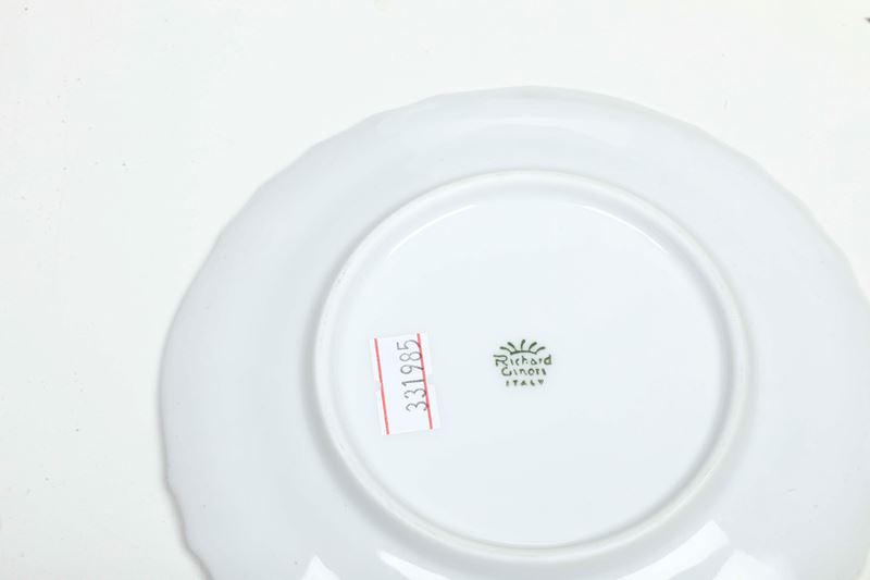 Porcellana. Marca: corona con “Richard Ginori Italy” in verde. Dimensioni: altezza tazza cm 5,5; diametro piattino cm 15; diametro piatto dolce cm 20. Conservazione: ottima
