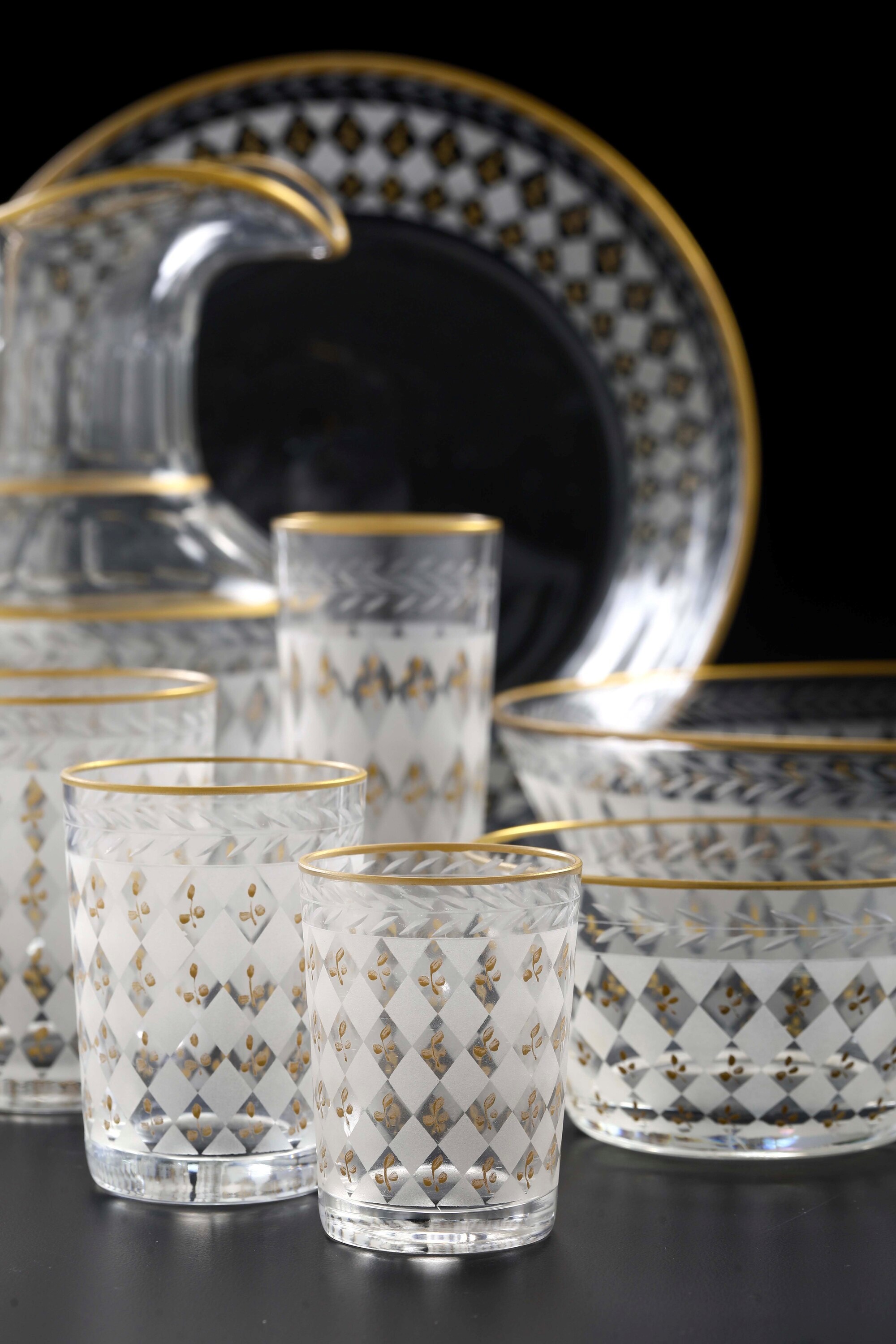 Il servizio di bicchieri per 24 persone conta 104 pezzi ed è composto da: 24 bicchieri (altezza cm 8,5); 24 bicchieri (altezza cm 7,5); 24 bicchieri da spumante (altezza cm 13); 6 brocche (altezza cm 22); 24 ciotole da dessert (altezza cm 6,5; diametro cm 12,5); 2 ciotole da portata (altezza cm 6; diametro cm 25,5)
