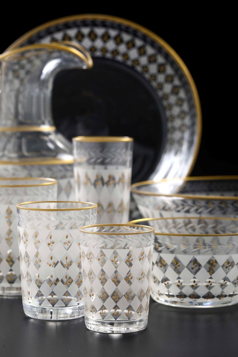 Con questo modello la Salir si ispira ai prototipi veneziani del Settecento. I cristalli di alta qualità, incisi e dorati a mano, presentano le superfici impreziosite da un'ampia fascia di piccoli rombi verticali che racchiudono un tocco d'oro