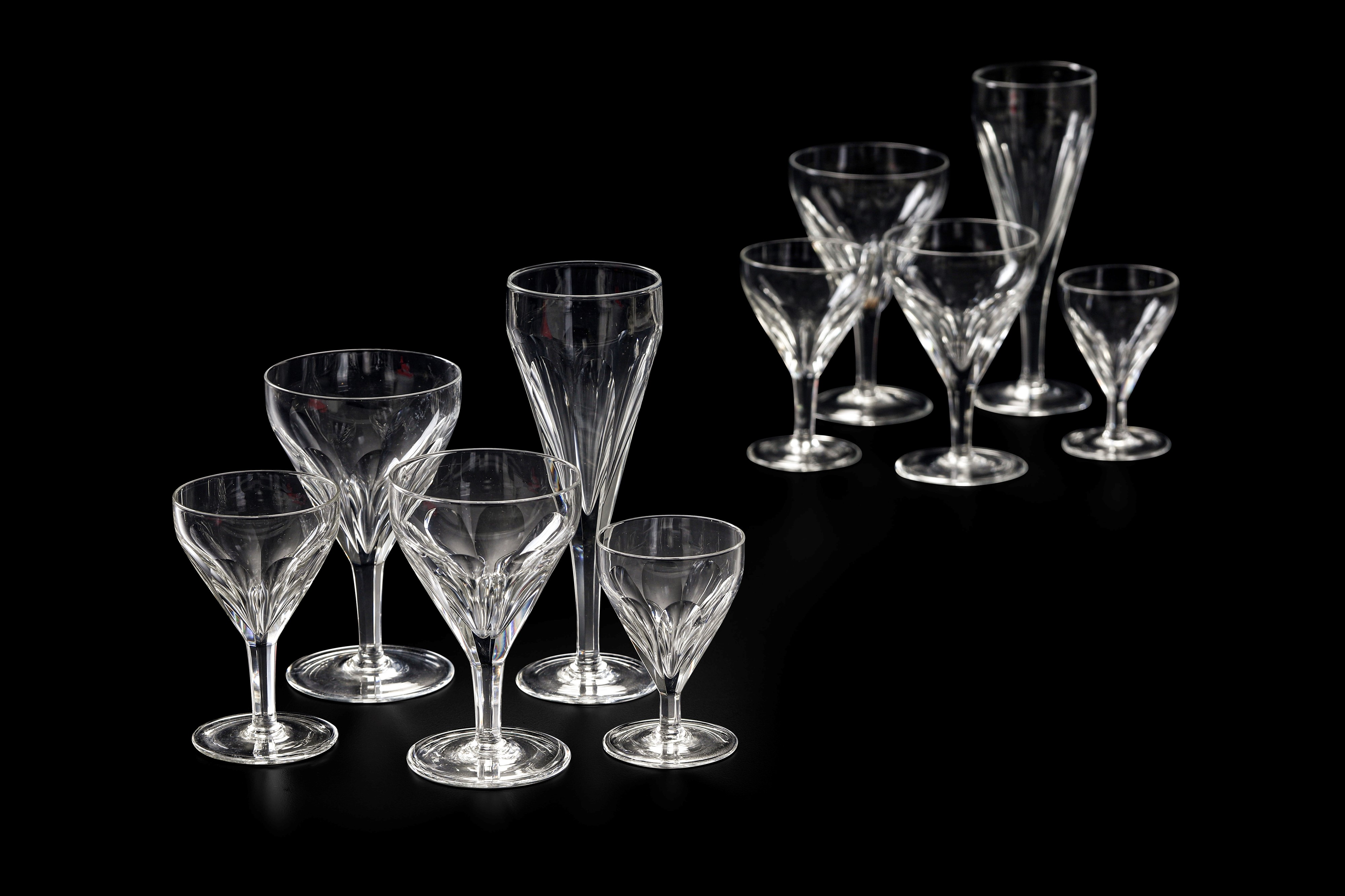 Il servizio per 10 persone più riserve, conta 56 pezzi ed e composto da: 11 calici da acqua (altezza cm 14); 10 calici da vino rosso (altezza cm 12,8); 11 calici da vino bianco (altezza cm 11,9); 12 flûtes (altezza cm 18,7); 12 calici da rosolio (altezza cm 9)