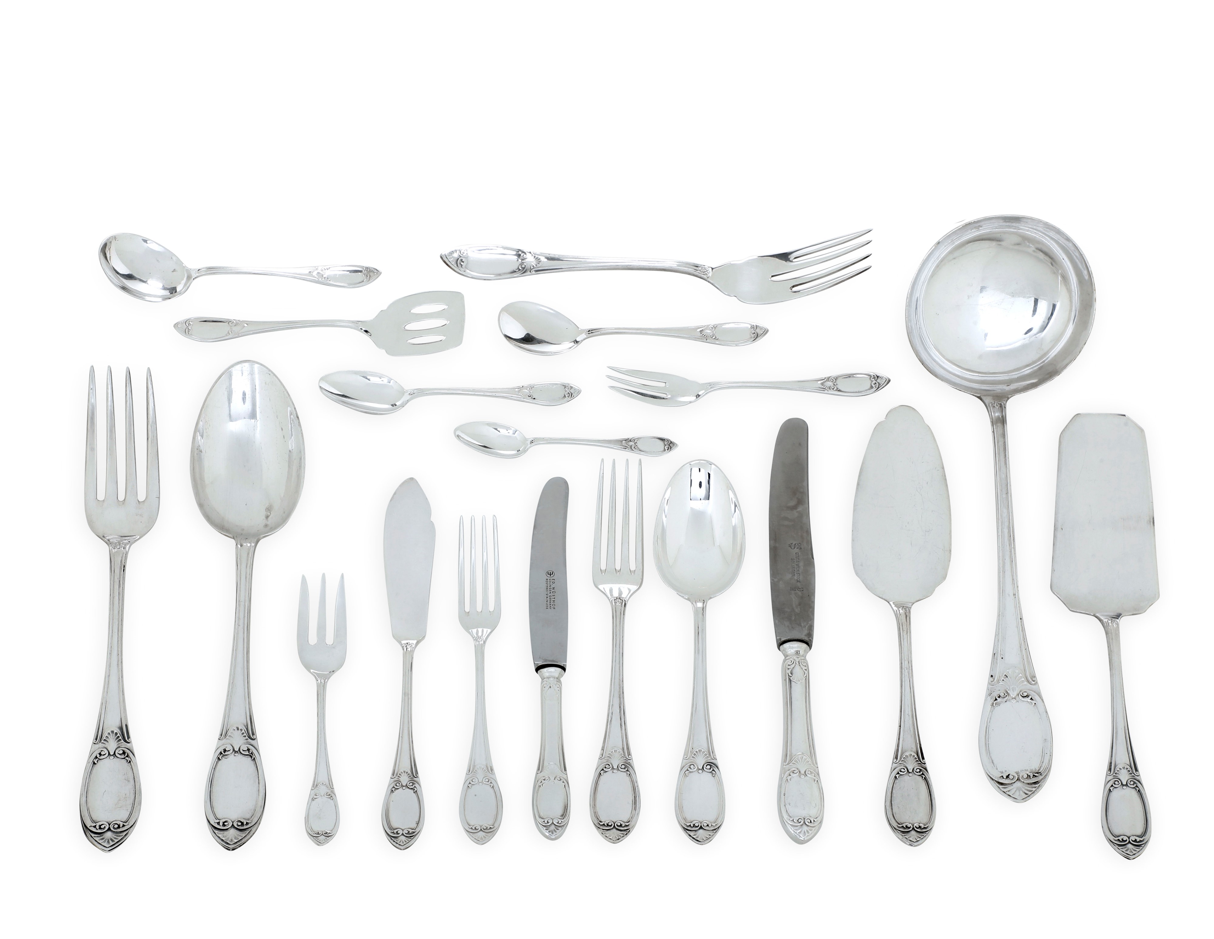Totale 174 pezzi, composto da: 24 coltelli, 24 forchette, 12 cucchiai, 12 forchette da pesce, 12 coltelli da pesce, 12 coltelli da frutta, 12 forchette da frutta, 12 forchettine da dolce, 12 palettine da gelato, 12 cucchiaini da tè, 12 cucchiaini da caffè, 2 posate da insalata con parti in osso, 1 paletta di servizio da pesce, 2 palette di servizio, 3 cucchiai di servizio, 3 forchette di servizio, 1 mestolo di servizio, 6 palette di servizio piccole varie forme.