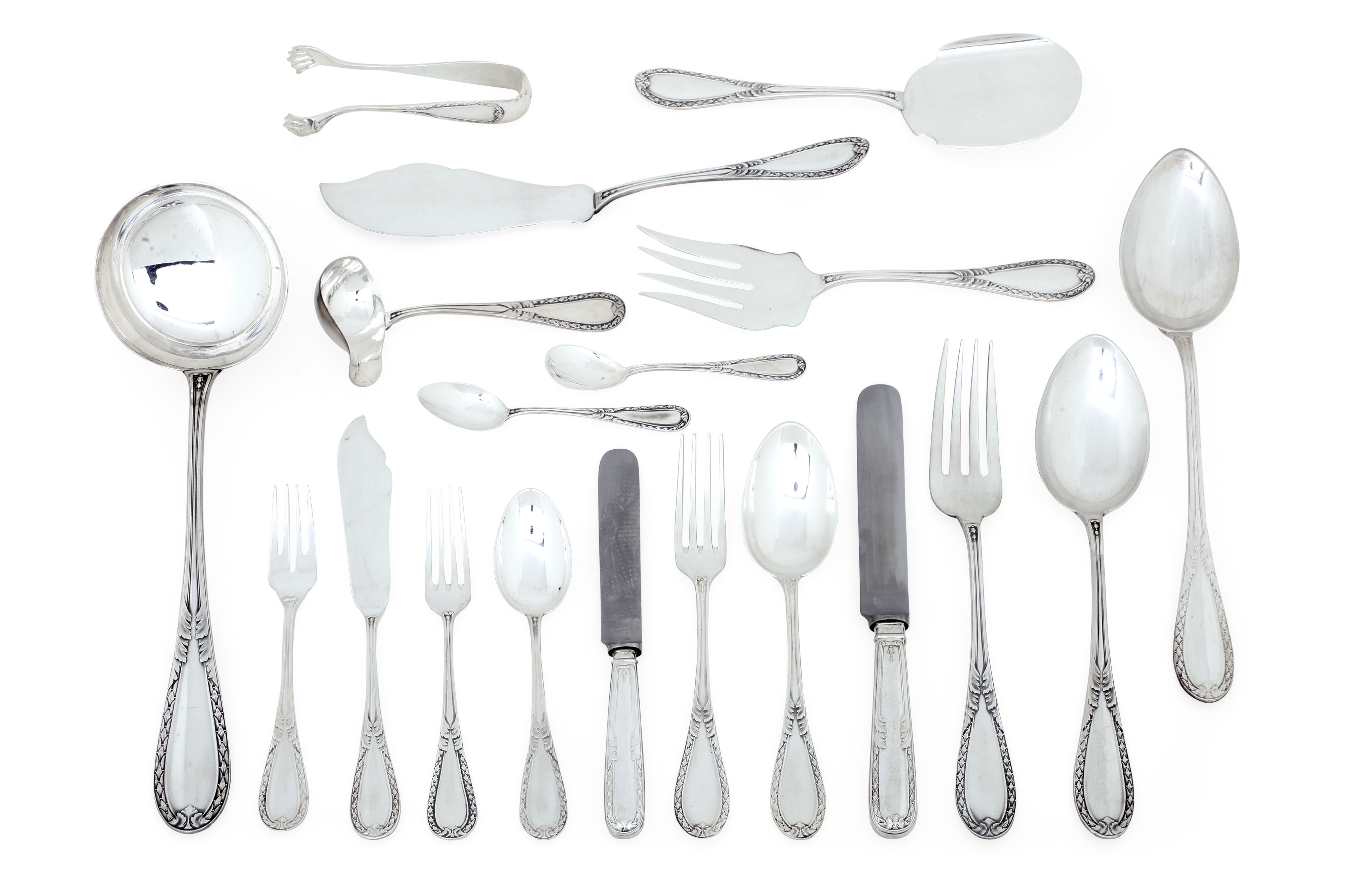 composto da 23 forchette, 24 coltelli e 12 cucchiai grandi, 12 forchette, 12 coltelli e 12 cucchiai da dessert, 12 forchette e 12 coltelli da pesce, 12 cucchiaini da tè, 12 palette da gelato e 11 posate da portata.