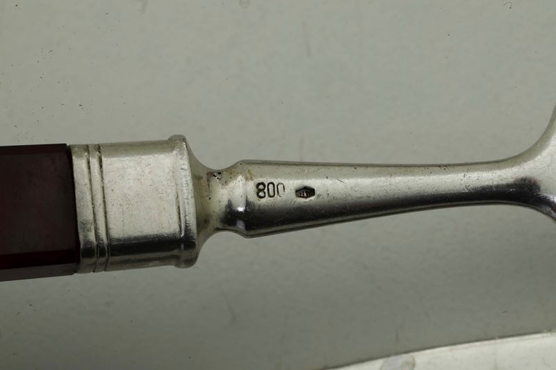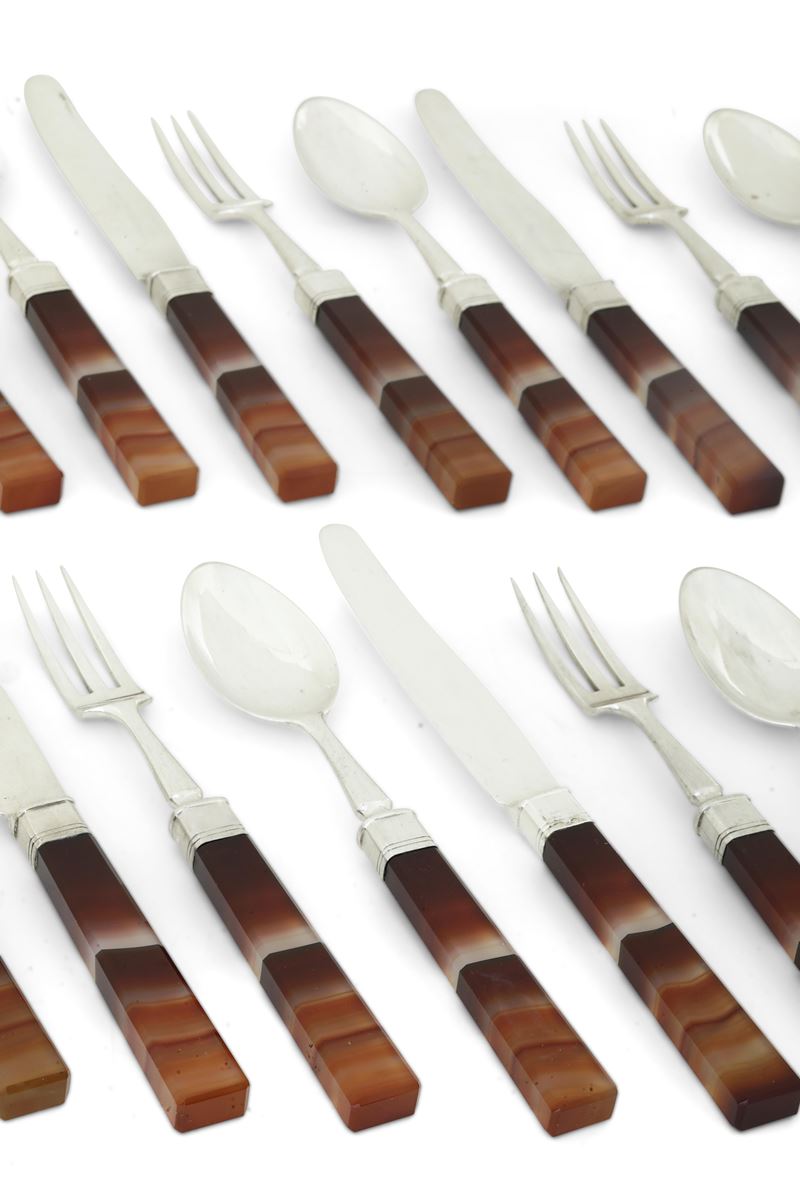 Servizio di posate da dessert con manico in agata. Argenteria toscana del XX secolo, bollo con fascio littorio in uso dal 195 al 1945, argentiere Ottavio Rogai, Firenze