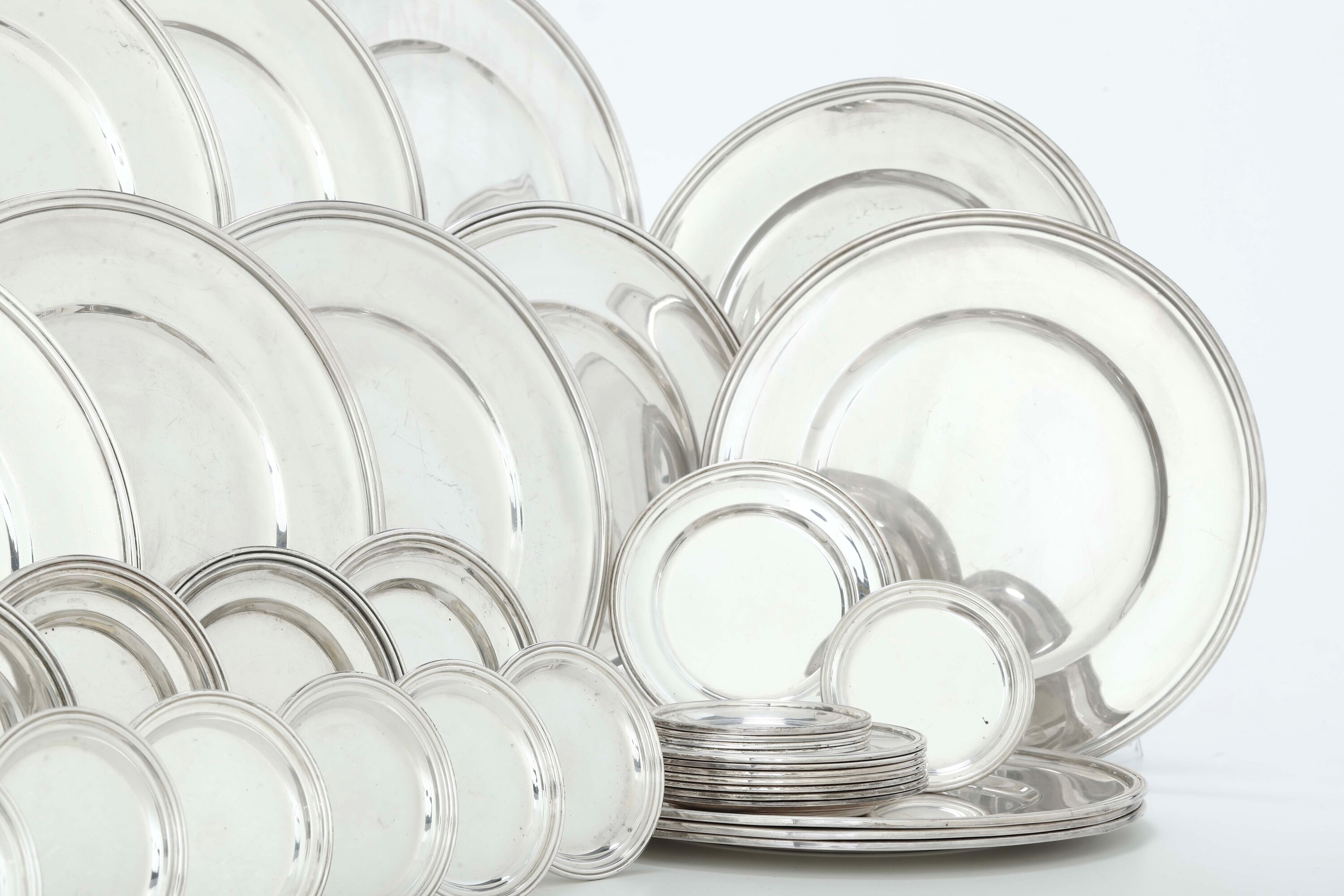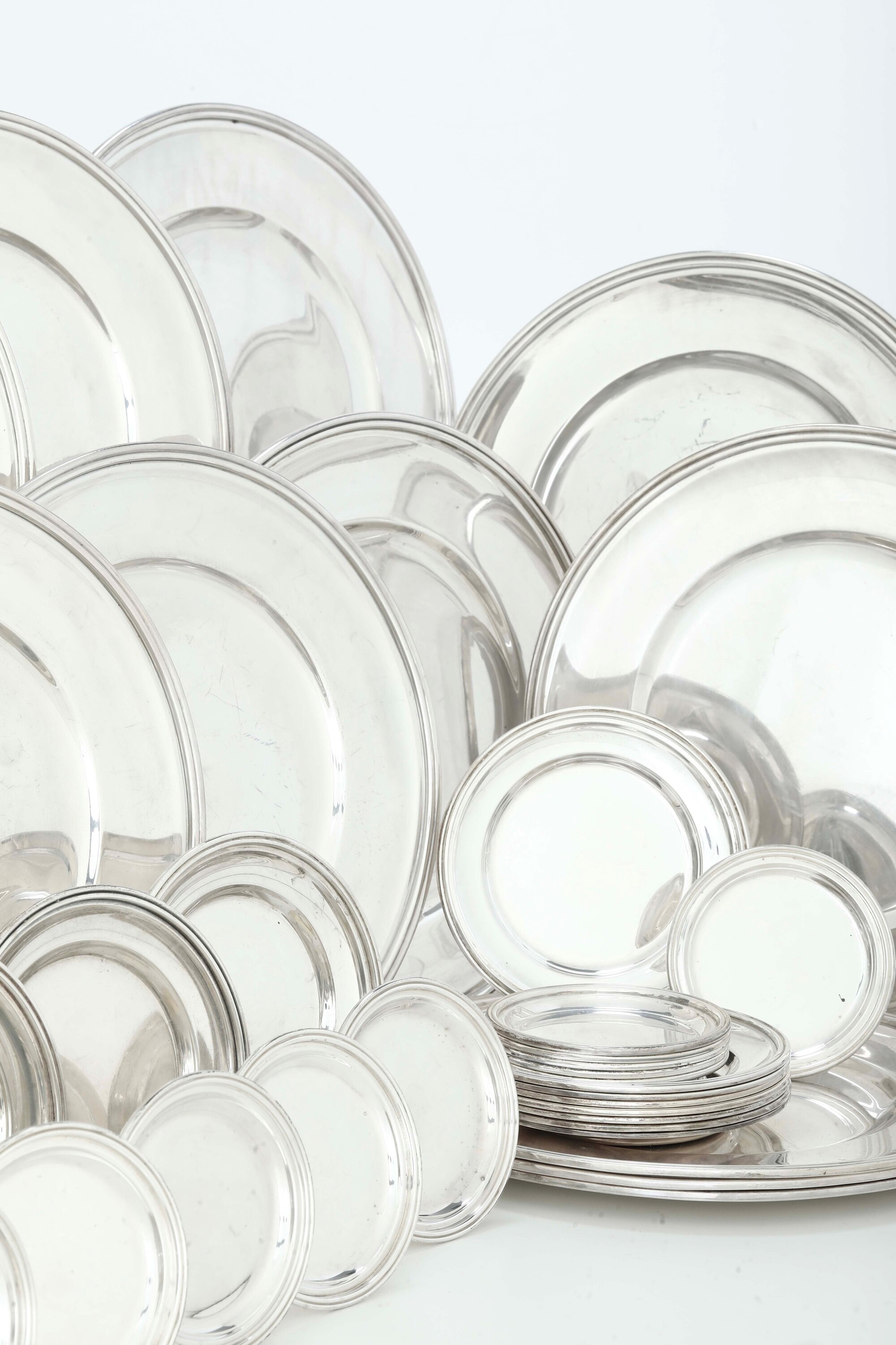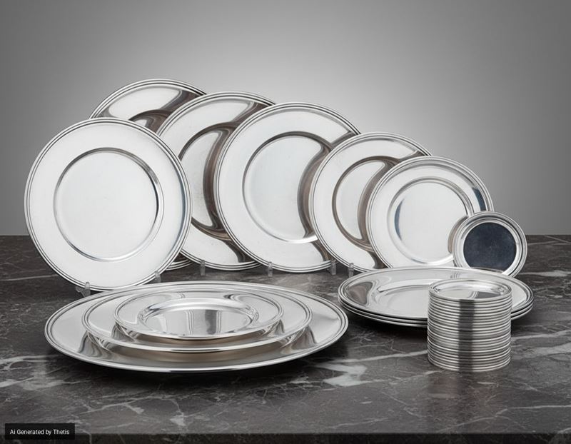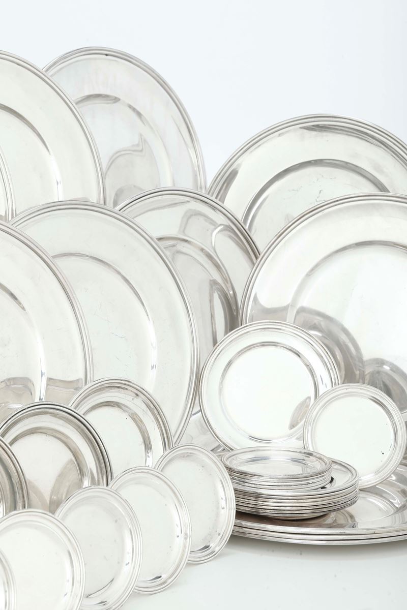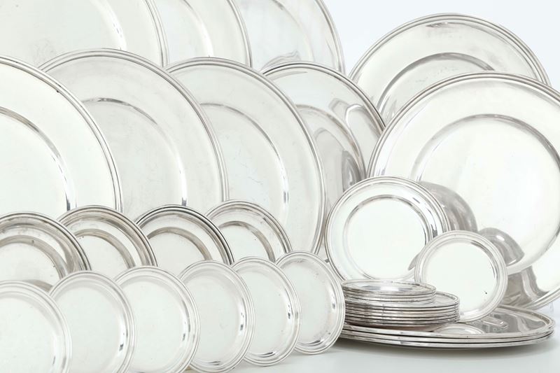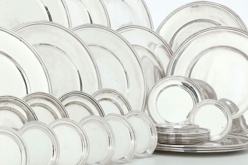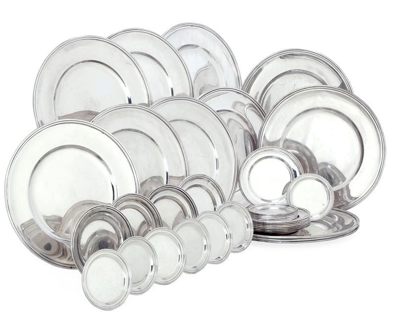 Set composto da dodici piatti, 12 piattini da pane e 12 sottobicchieri. Argenteria italiana del XX secolo. Argentiere Mario [..]
