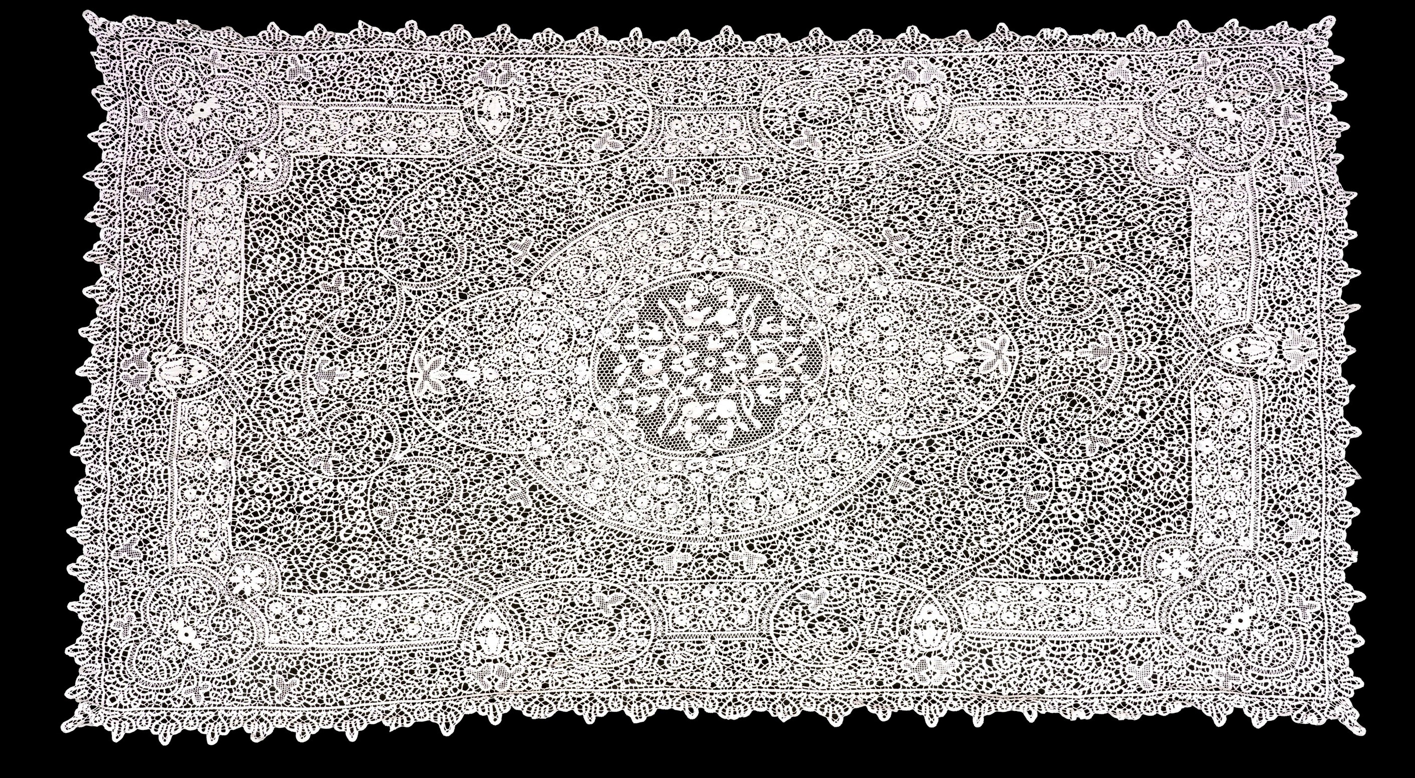 In questo prezioso filato, la raffinatezza del pizzo di Burano, delinea ornamenti floreali e complessi ramages che rimandano alla bellezza del mondo naturale. Alle quattro estremità degli angoli, infine, ritroviamo delicati trifogli simbolo di fortuna e protezione