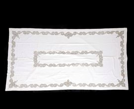 Tovaglia in lino color beige decorata da splendidi ricami in pizzo di Burano