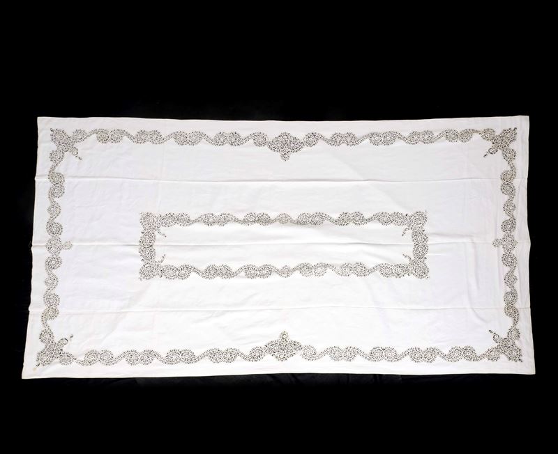 Dimensioni: tovaglia (cm 297x171); tovaglioli (cm 42x42). Conservazione: ottima; qualche piccola macchia