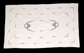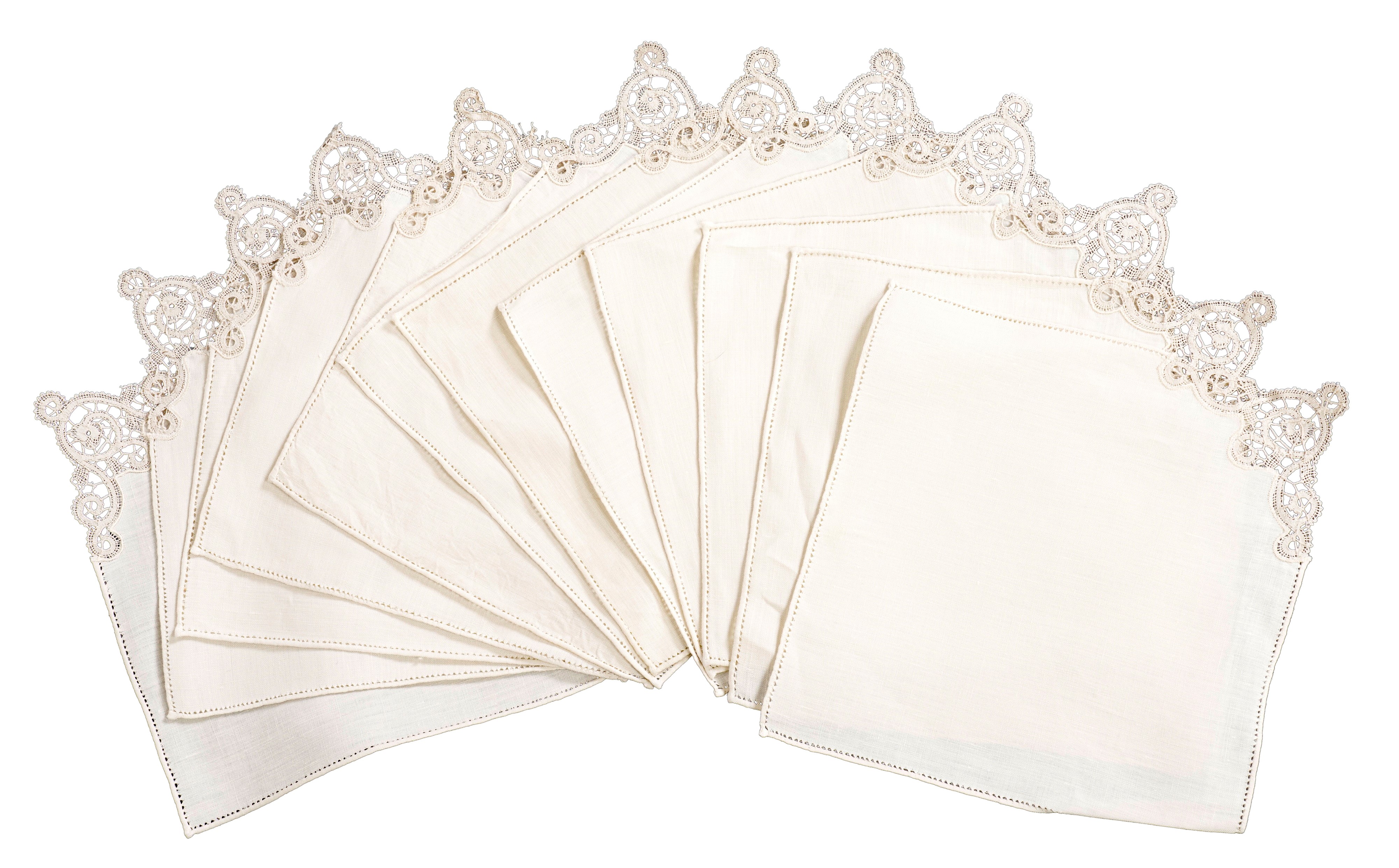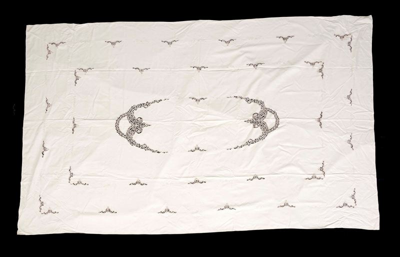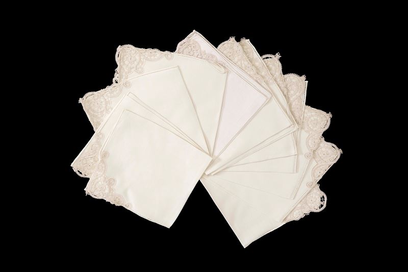Dimensioni: tovaglia (cm 276x176); 12 tovaglioli (cm 42x42); 12 tovagliolini (cm 23x23). Conservazione: ottima; qualche piccolo alone sui tovaglioli
