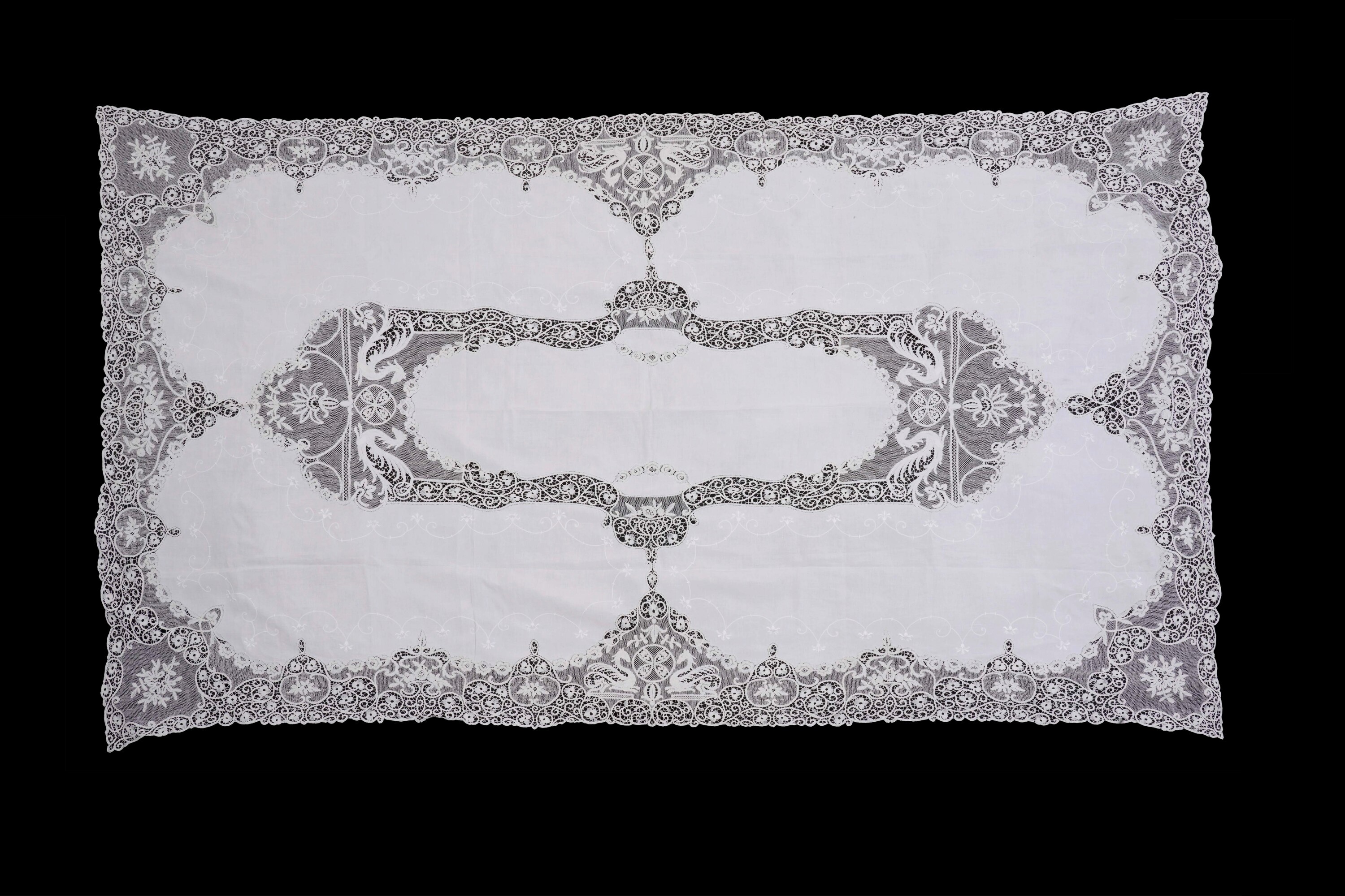 Pregiatissimo filato in lino color ecrù adornato da splendidi ricami in pizzo di Burano raffiguranti delicati ramages di fiori, oltre che frutti e splendide figure di grifoni alati; un rimando allo stile decorativo “a grottesca” che trae origine dai decori ritrovati nelle antiche rovine delle domus romane