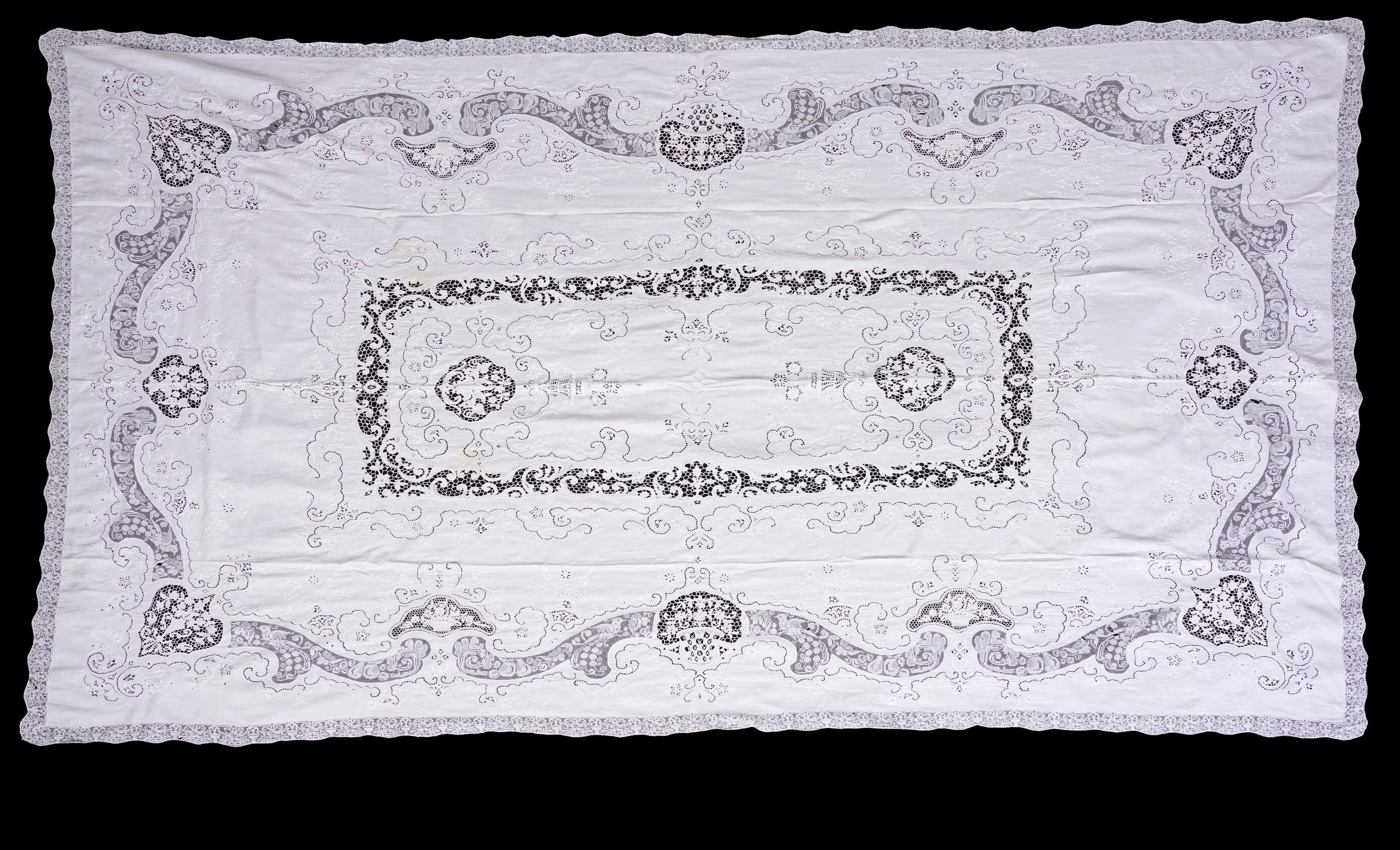 Dimensioni: cm 313x198. Conservazione: ottima; qualche lieve macchia di umidità; piccoli strappi al pizzo