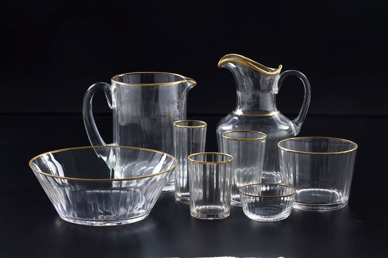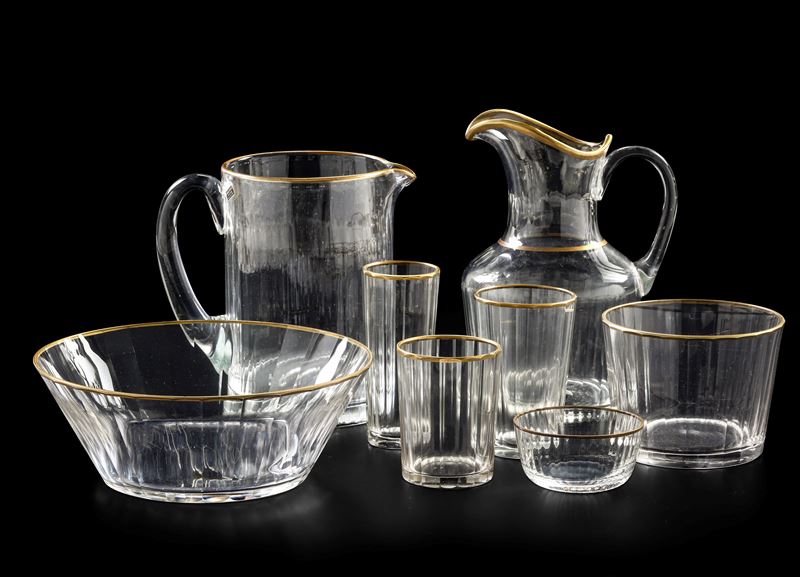 Il servizio conta 207 pezzi ed è così composto: 113 bicchieri (altezza cm 11,3 circa; 3 pezzi con piccola sbeccatura); 23 bicchieri (altezza cm 9; 2 pezzi con piccola sbeccatura); 23 flûtes (altezza cm 12,5); 32 ciotoline (altezza cm 4,5; cm 6; diametro cm 9; 1 pezzo con insignificante sbeccatura); 4 ciotole (altezza cm 10; diametro cm 13; 1 pezzo con due piccole sbeccature); 1 ciotola da portata (altezza cm 8; diametro cm 21); 6 caraffe (altezza cm 18,5); 2 caraffe (altezza cm 23); 3 oliere (altezza cm 16,5)