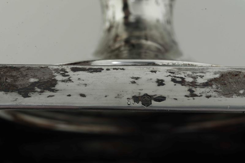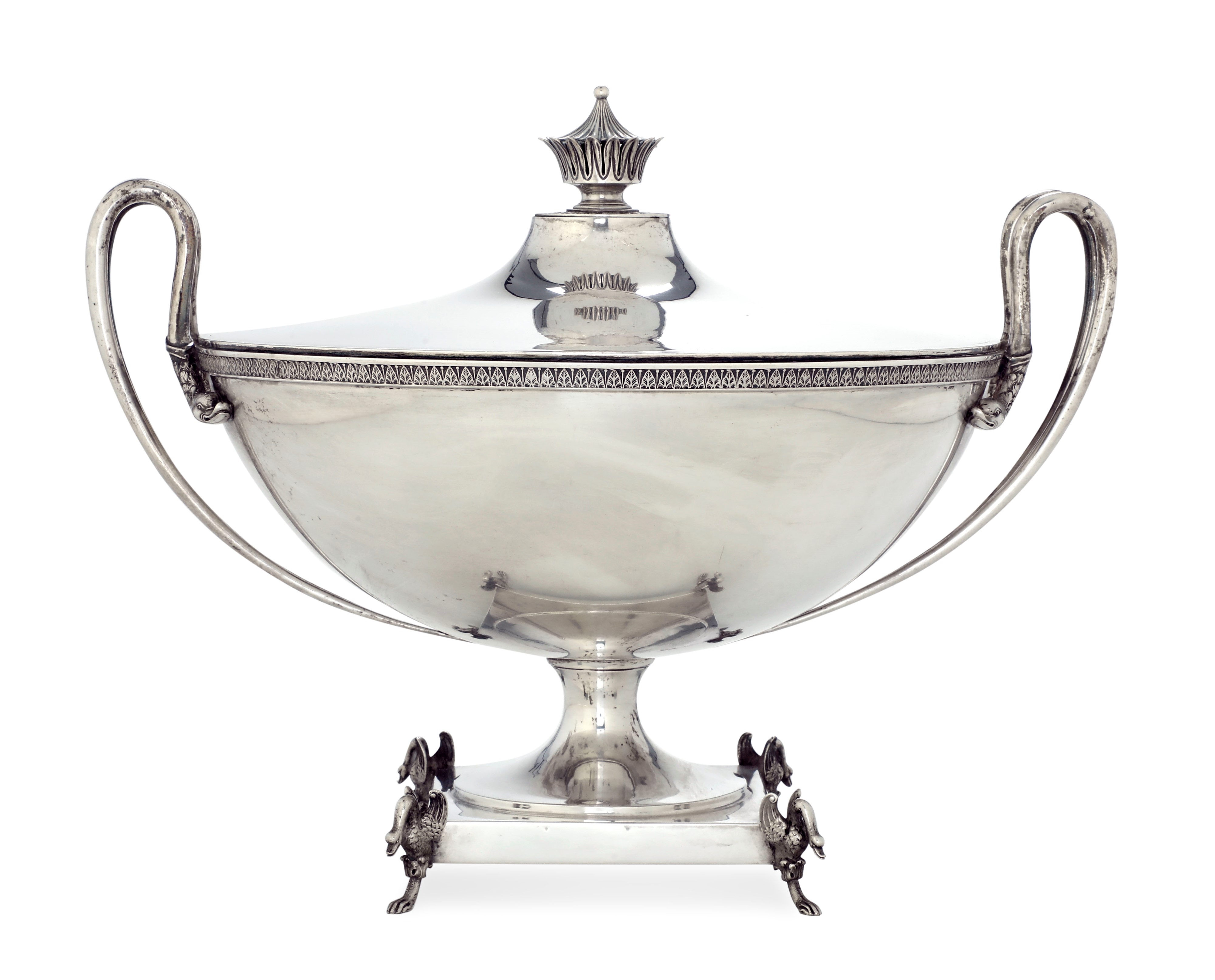 Anse laterali doppie con teste di cigno e piedini che ne ripetono il soggetto. Fascia e presa con motivo a foglie lanceolate