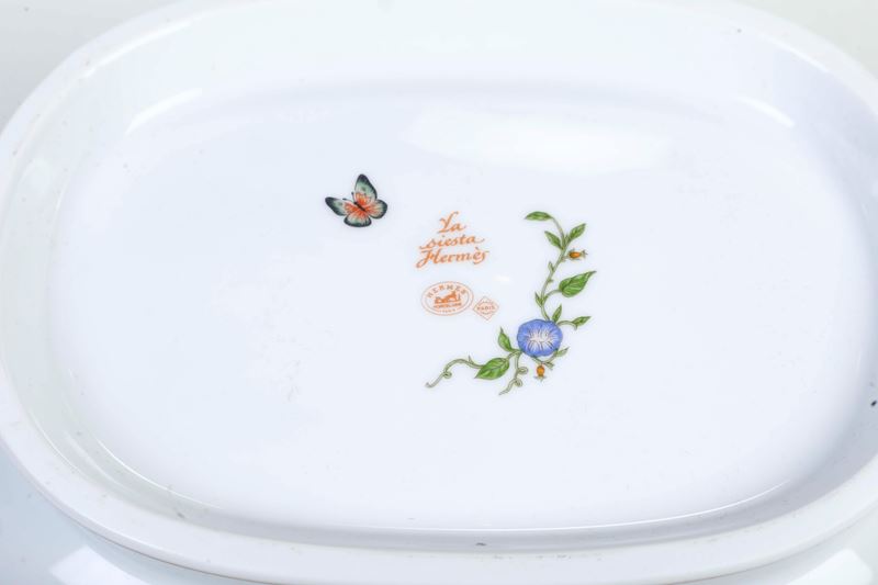 Porcellana. Marca: "La siesta Hermès"; simbolo grafico con "Hermès Porcelaine Paris" e "Hermès Paris France". Dimensioni: altezza cm 15,5; cm 32,5x20,5. Conservazione: ottima. Scatola originale