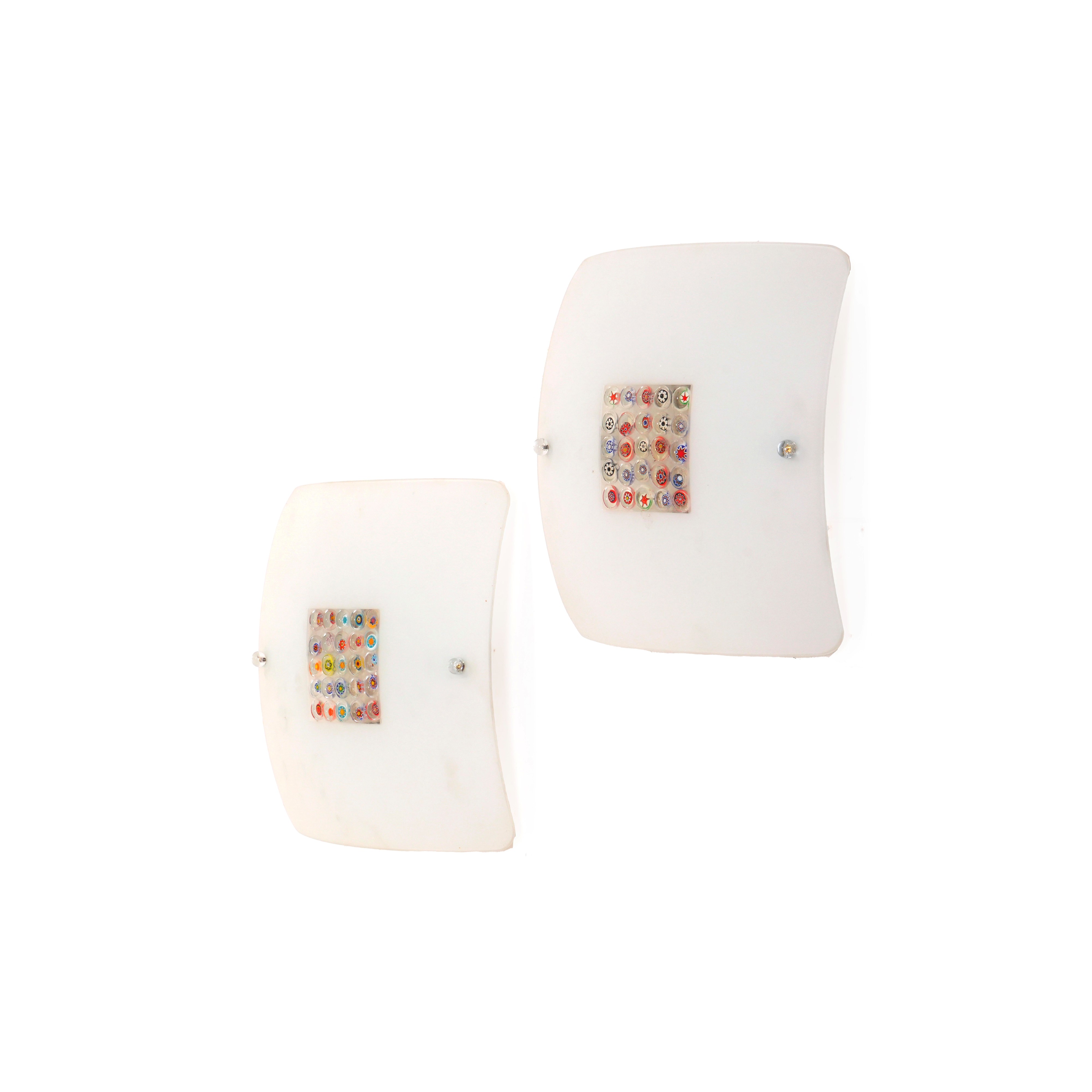 Struttura in metallo e diffusore in vetro con decoro in vetro policromo.