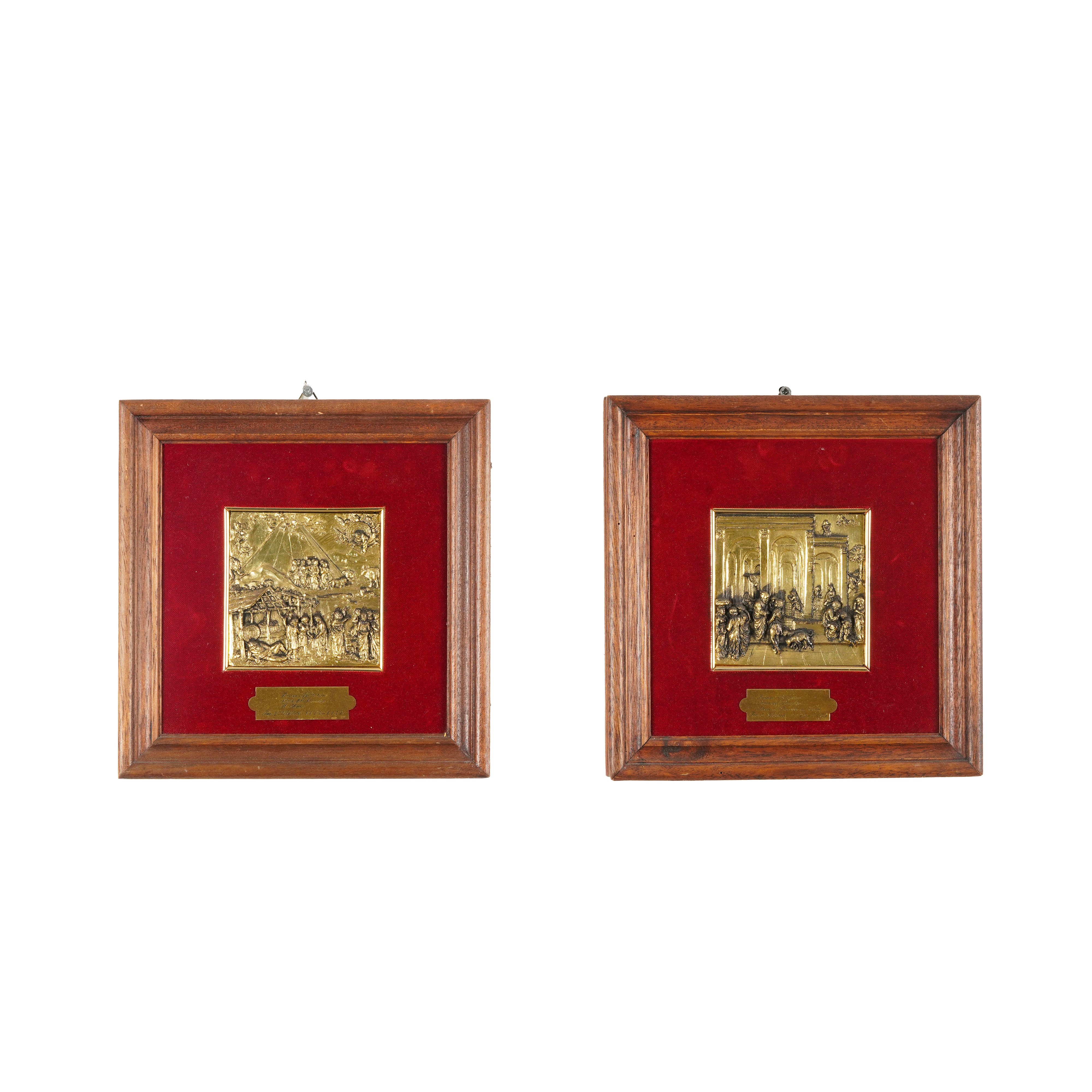 Coppia di riproduzioni in metallo dorato di formelle della Porta del Paradiso del Battistero di Firenze; montate entro cornice