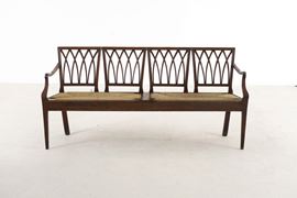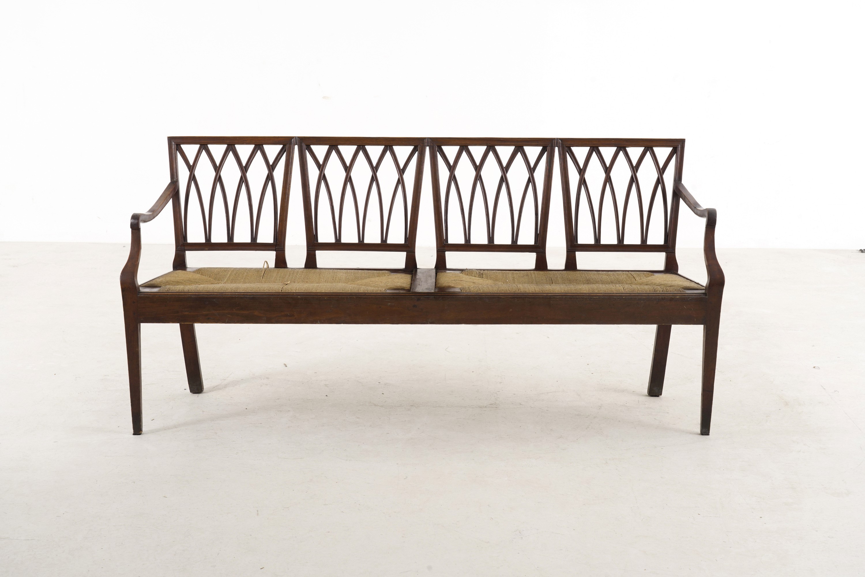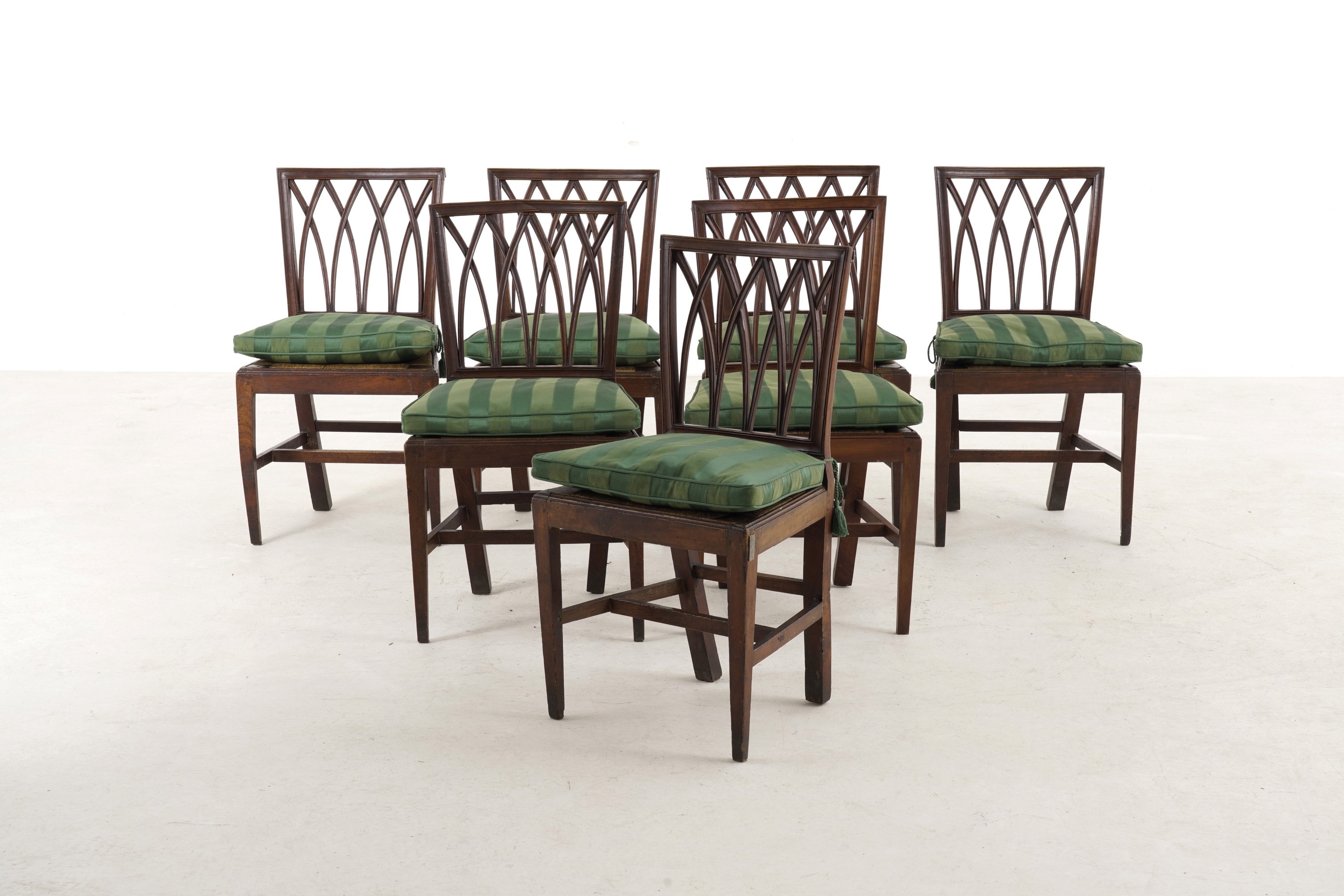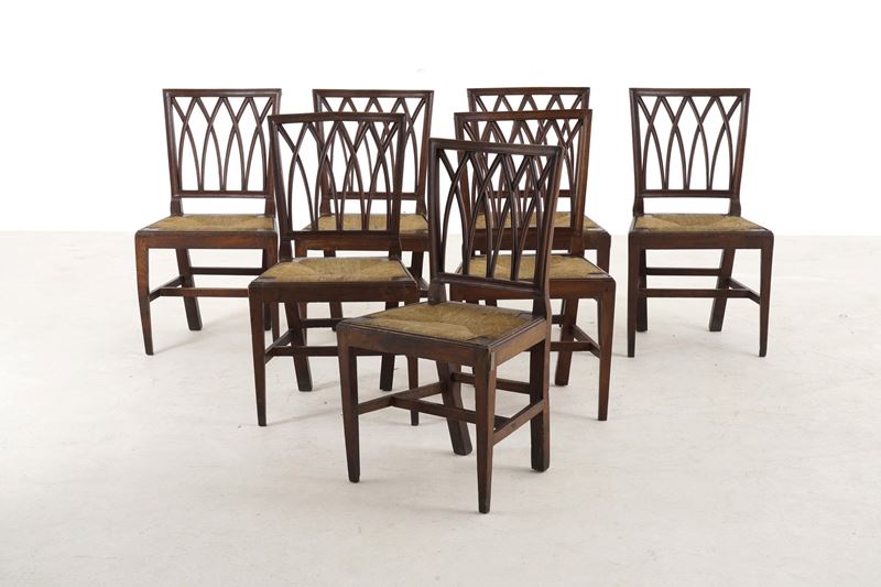 Schienali traforati, sedute impagliate, gambe anteriori rastremate