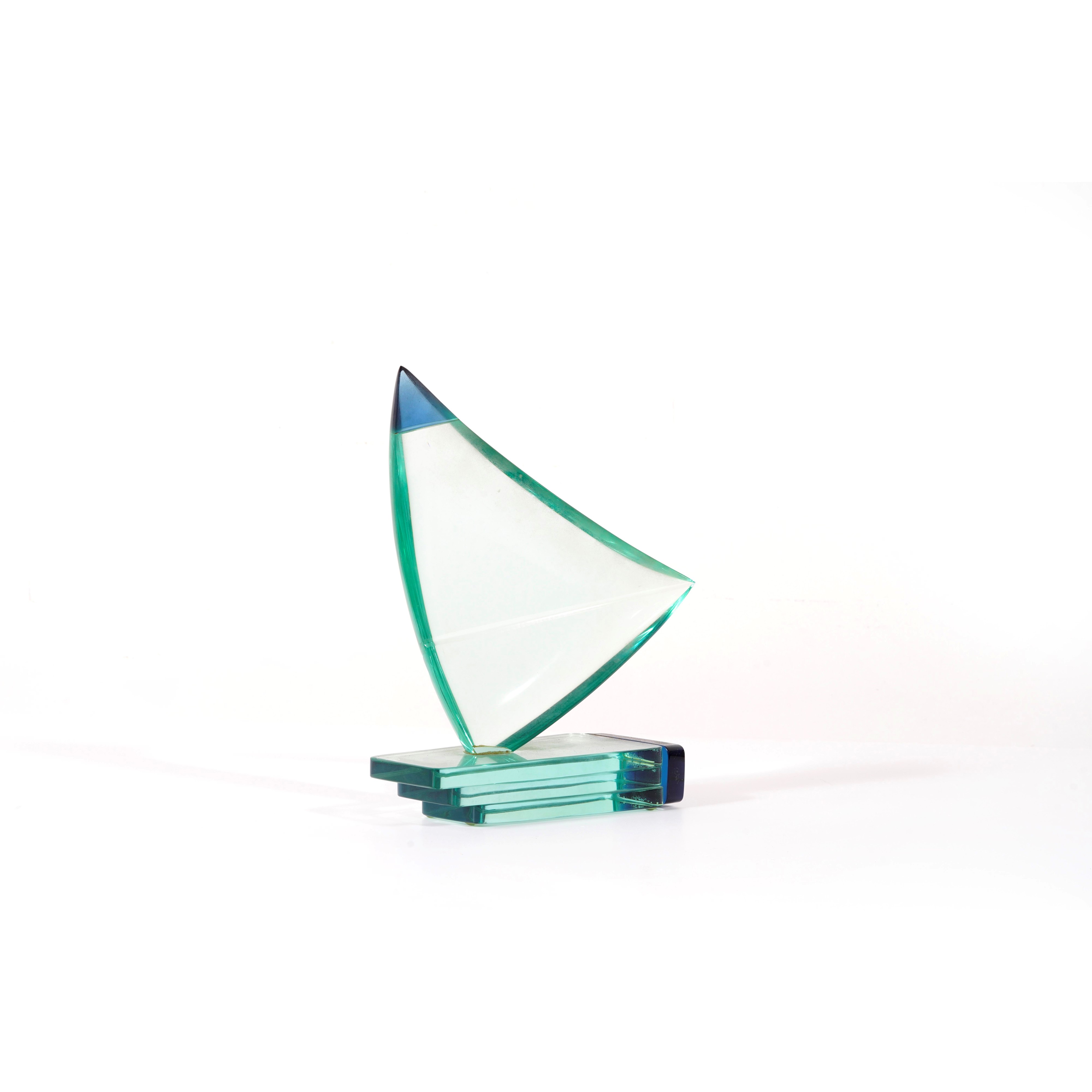 Scultura in vetro molato parzialmente policromo a foggia di vela
