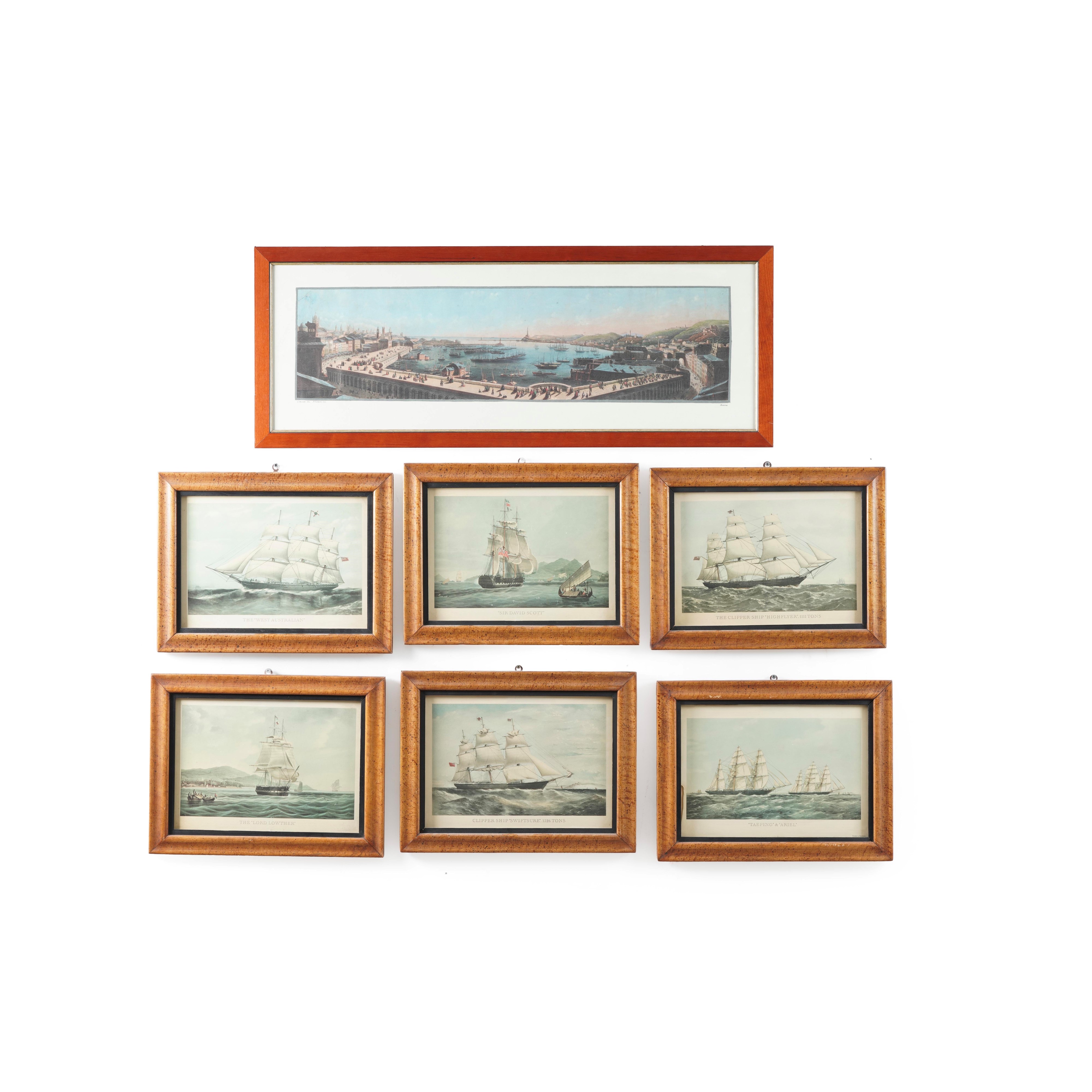 Sei stampe raffiguranti velieri e una del porto di Genova a colori