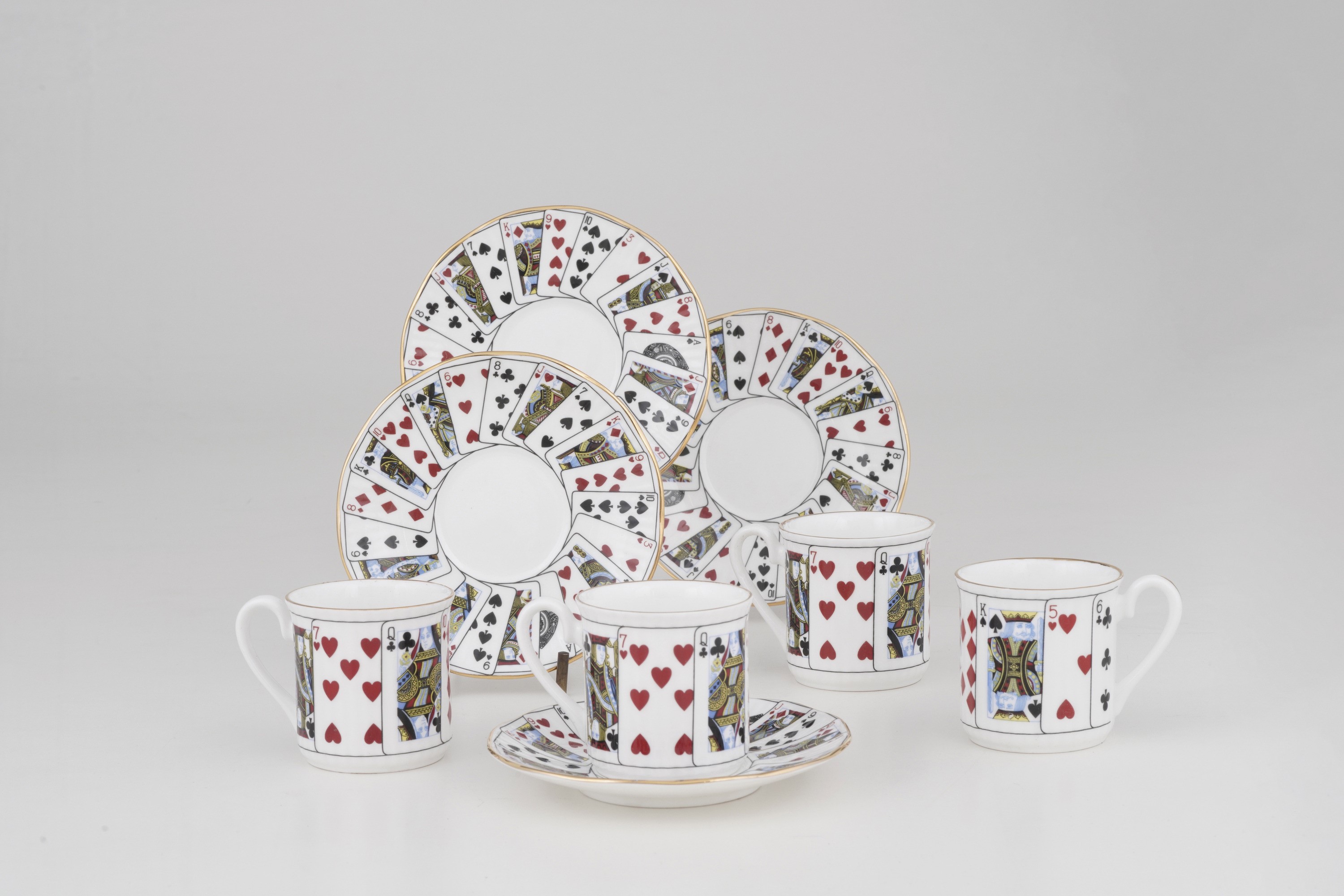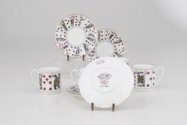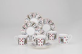 Set elisabettiano di quattro tazze e piattini di demitasse in porcellana fine Staffordshire, entro scatola originale