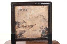 Paravento con dipinto orientale raffigurante paesaggio, due cassettini nella fascia, gambe rastremate