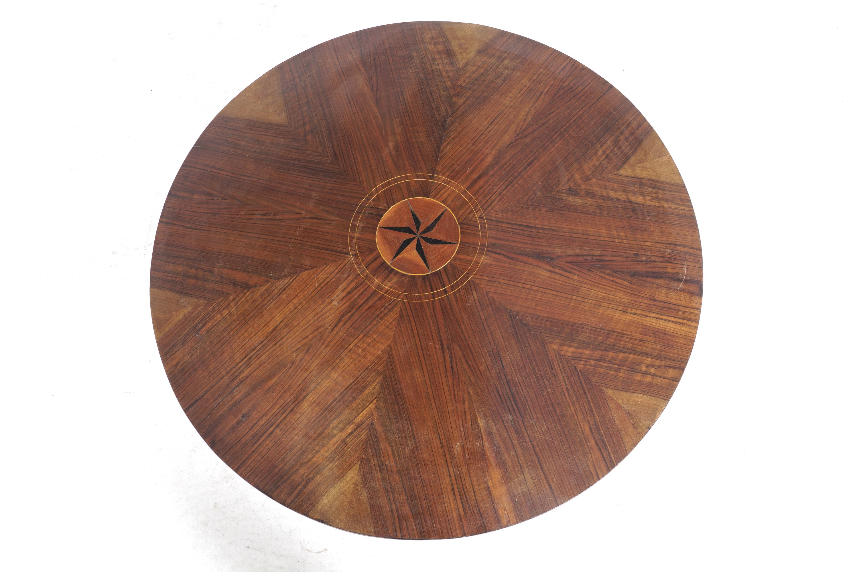 Tavolo tondo con piano lastronato e intarsiato. XIX secolo