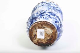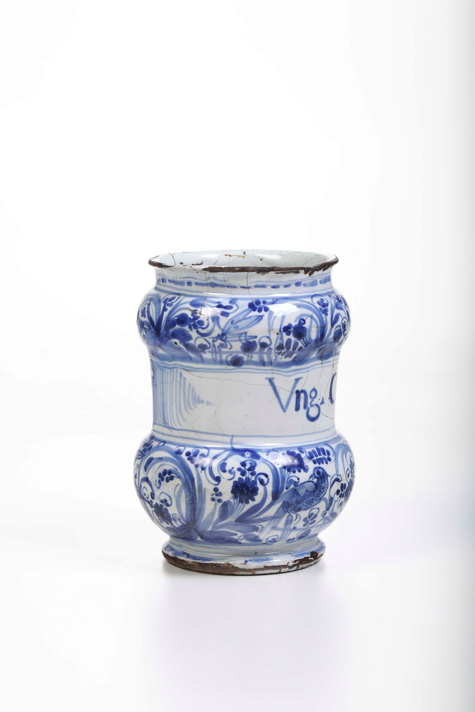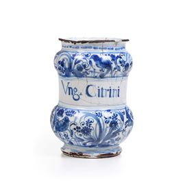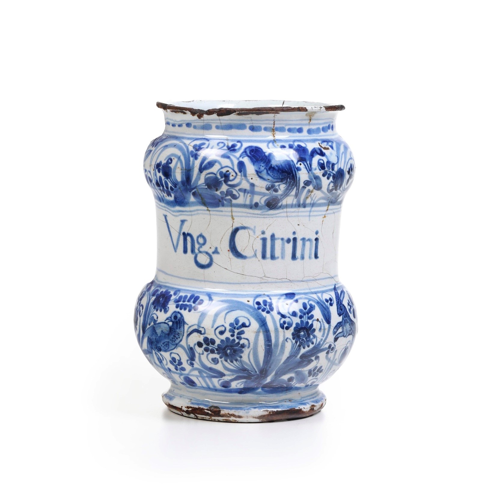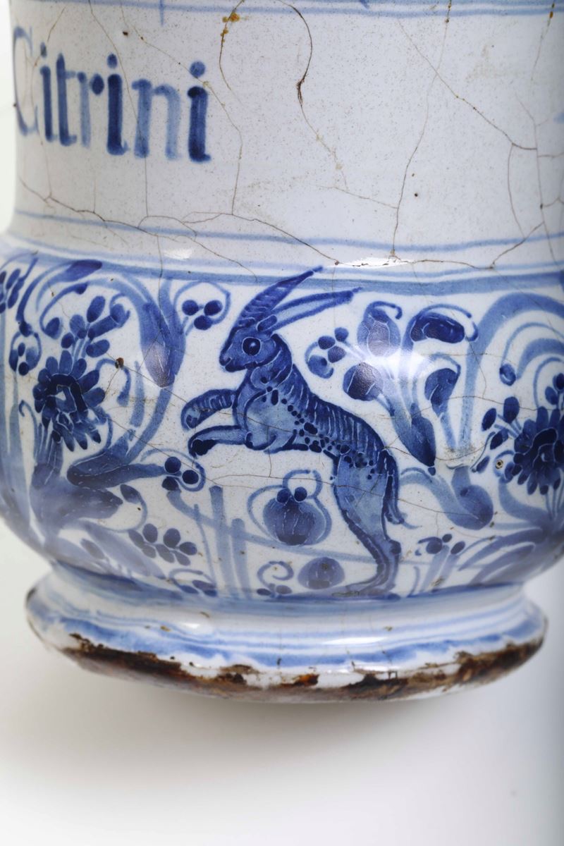 Albarello a rocchetto con due rigonfiamenti a cipolla e fascia mediana liscia che ospita la scritta apotecaria “Ung. Citrini”. Le due cipolle sono decorate in blu di cobalto in stile “calligrafico naturalistico” con uccelli e una lepre
