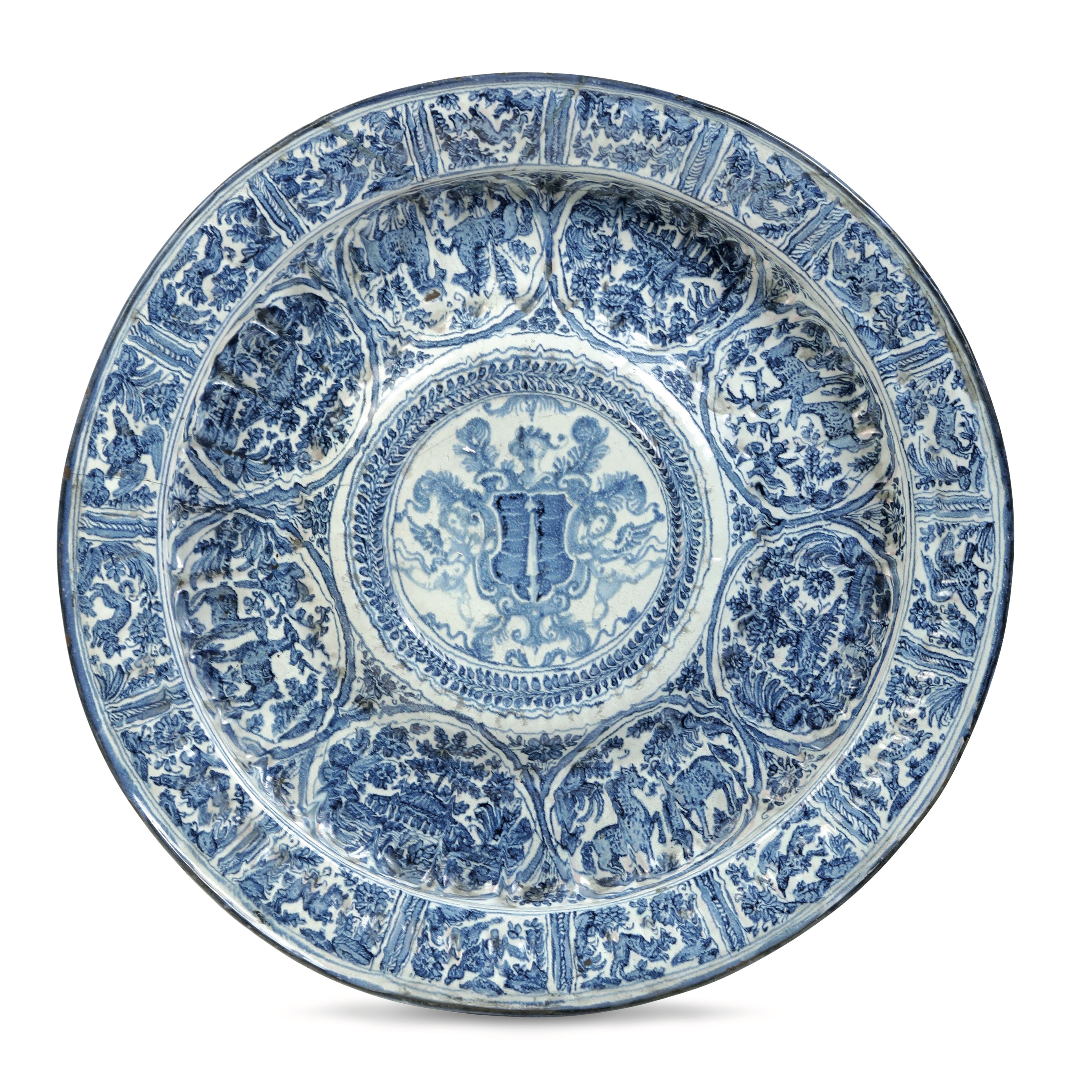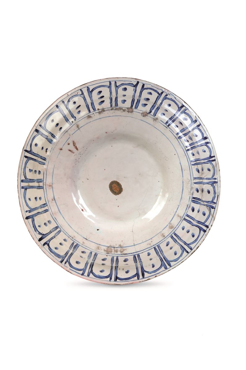 Si tratta di un grande bacile da acquereccia, con umbone centrale e ampia parete a baccellature; retro apodo. Nel recto, all’interno di un medaglione centrale, corrispondente all’umbone, campeggia uno stemma ornato di cimiero e piume, e sorretto da due putti; attorno, fino alla tesa, si dispongono otto medaglioni ovali racchiudenti coppie di quadrupedi e caseggiati, su sfondo a motivi fitomorfi; sulla tesa invece si alternano partizioni delimitate da strette fasce, che racchiudono piccoli animali (uccelli e quadrupedi), attorniati da rameggi e corolle. Nel verso, lungo la tesa è dipinta una fascia con motivo di pseudo baccellature. Dipinto in monocromia blu.