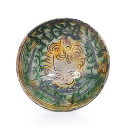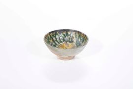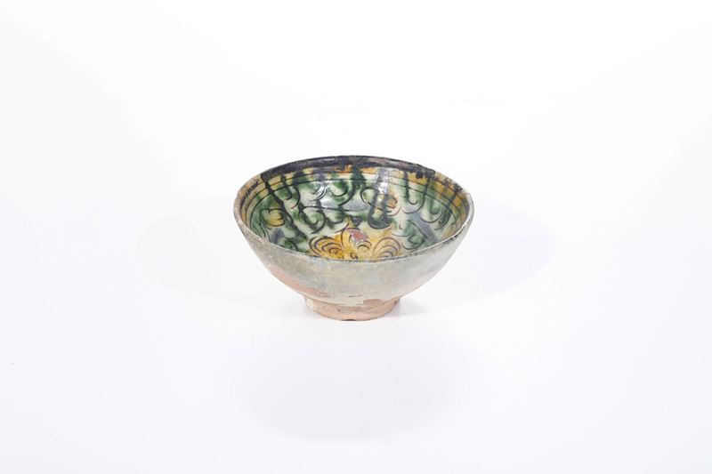 La ciotola, dalla forma emisferica con basso piede ad anello, è decorata all’interno in verde ramina, giallo ferraccia e azzurro, con la testa di un cherubino attorniata da piccoli cerchi e spirali