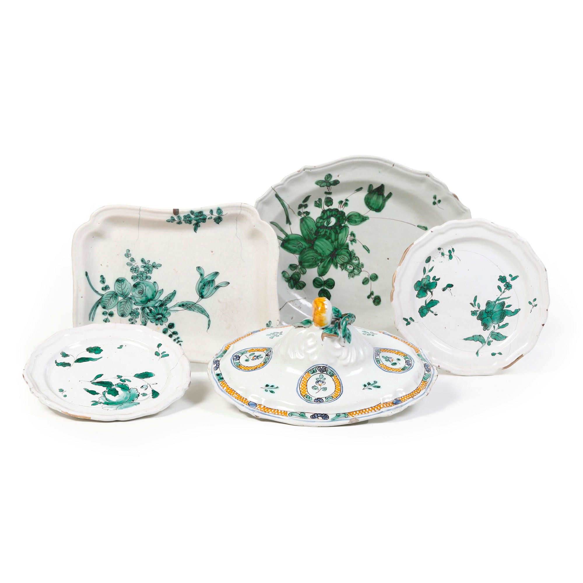 Al lotto si aggiungono 4 piatti in maiolica settecentesca decorati in monocromia verde. Diverse forme e dimensioni, con felature e sbeccature