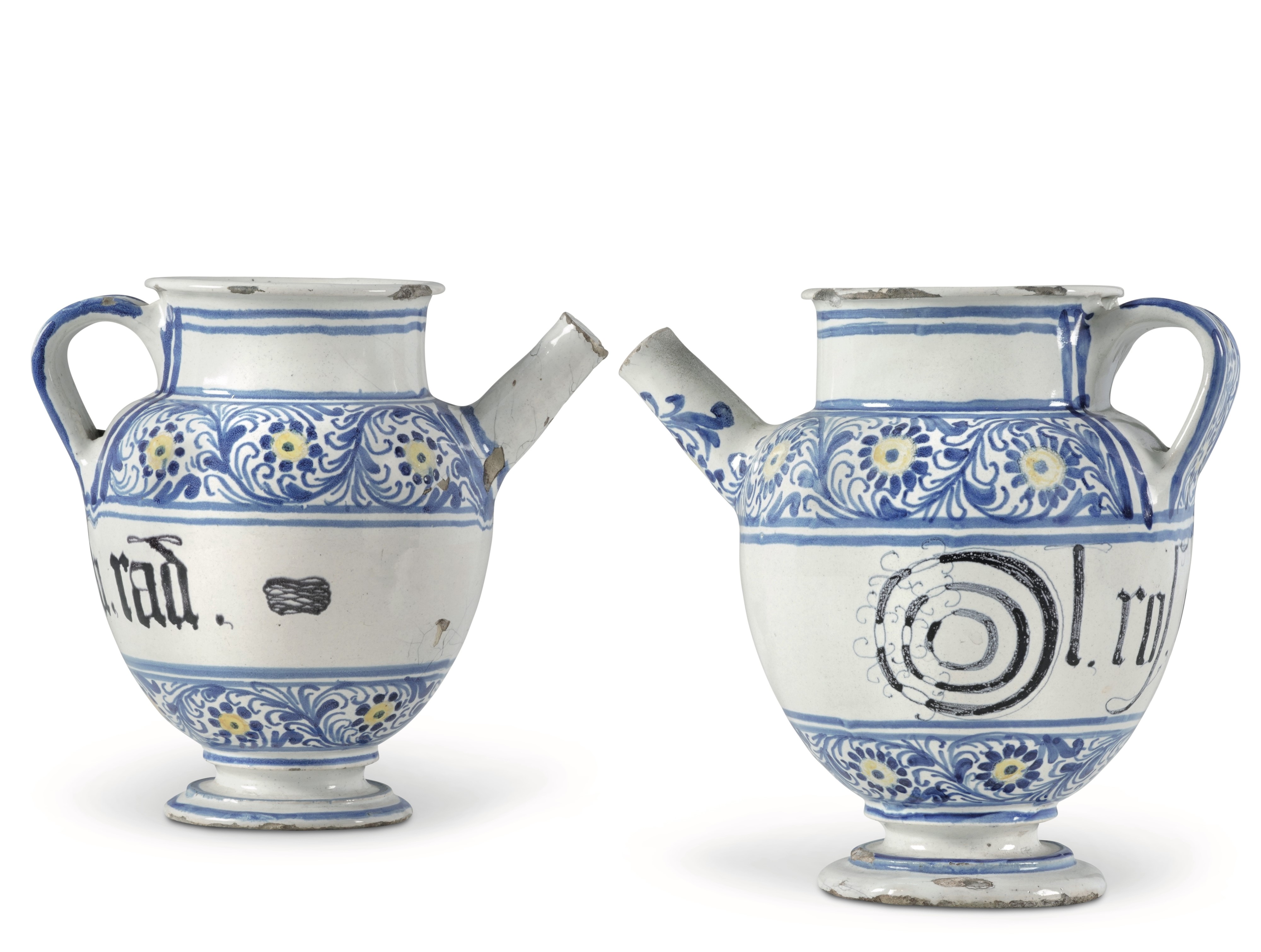 Dal corpo ovoidale su base sagomata con beccuccio cilindrico e ansa a nastro, questi orcioli sono decorati in blu di cobalto, giallo e ocra su smalto bianco. Una fascia centrale reca l’iscrizione apotecaria a caratteri gotici in manganese incorniciata da due fasce con girali fogliate e un fiore molto stilizzato al centro