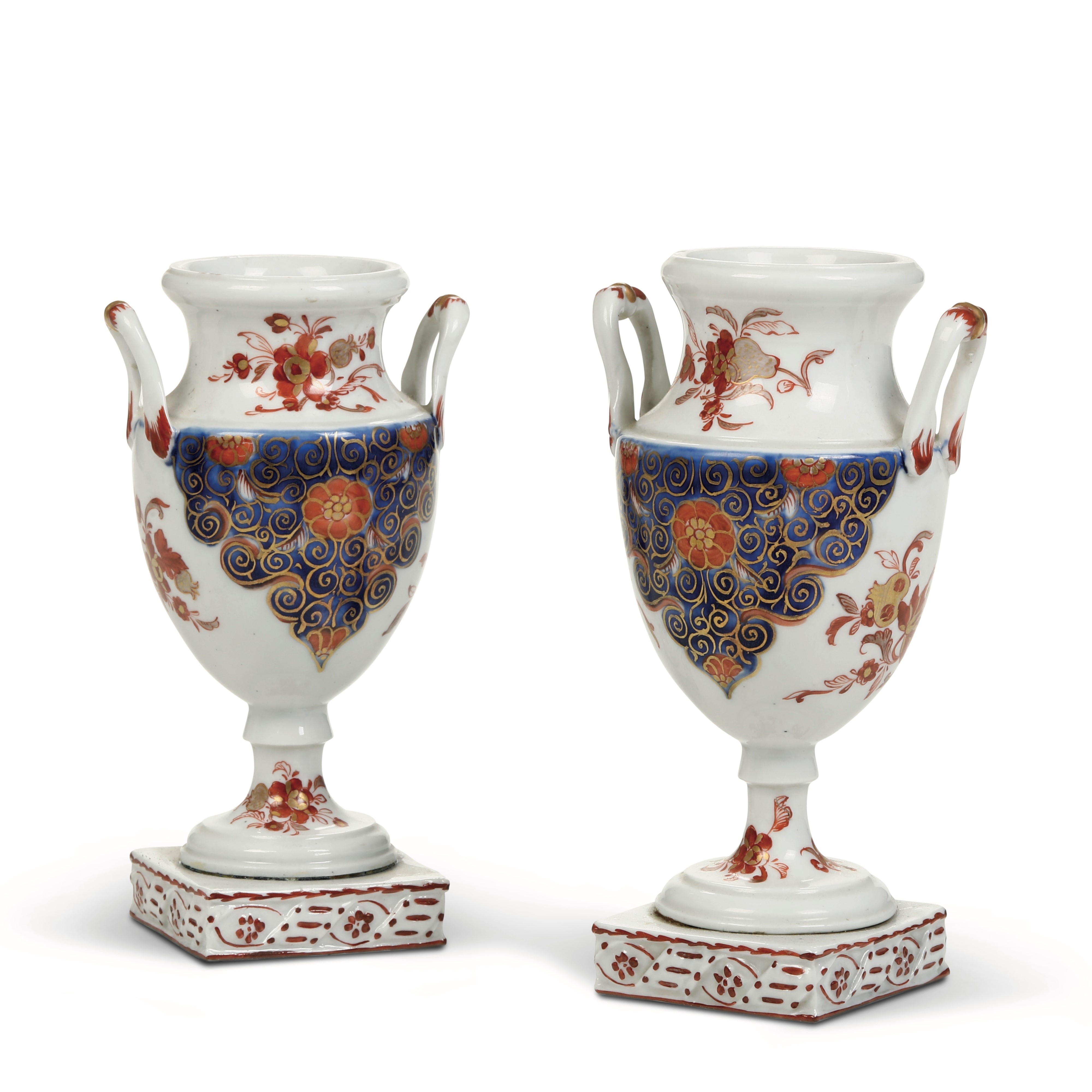 Porcellana. Marca: assente. Altezza totale cm 15 circa. Conservazione: ottima; le basi a plinto, forse della manifattura Ginori, sono state aggiunte in un secondo momento per conferire maggiore stabilità ai vasi