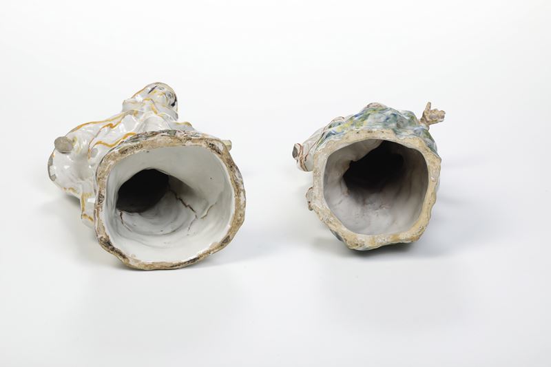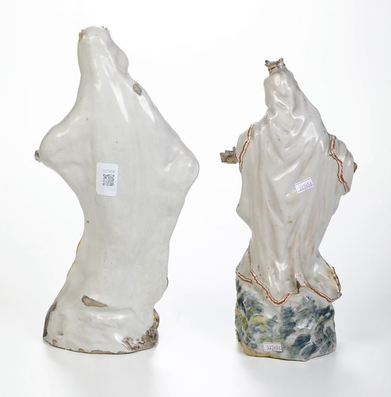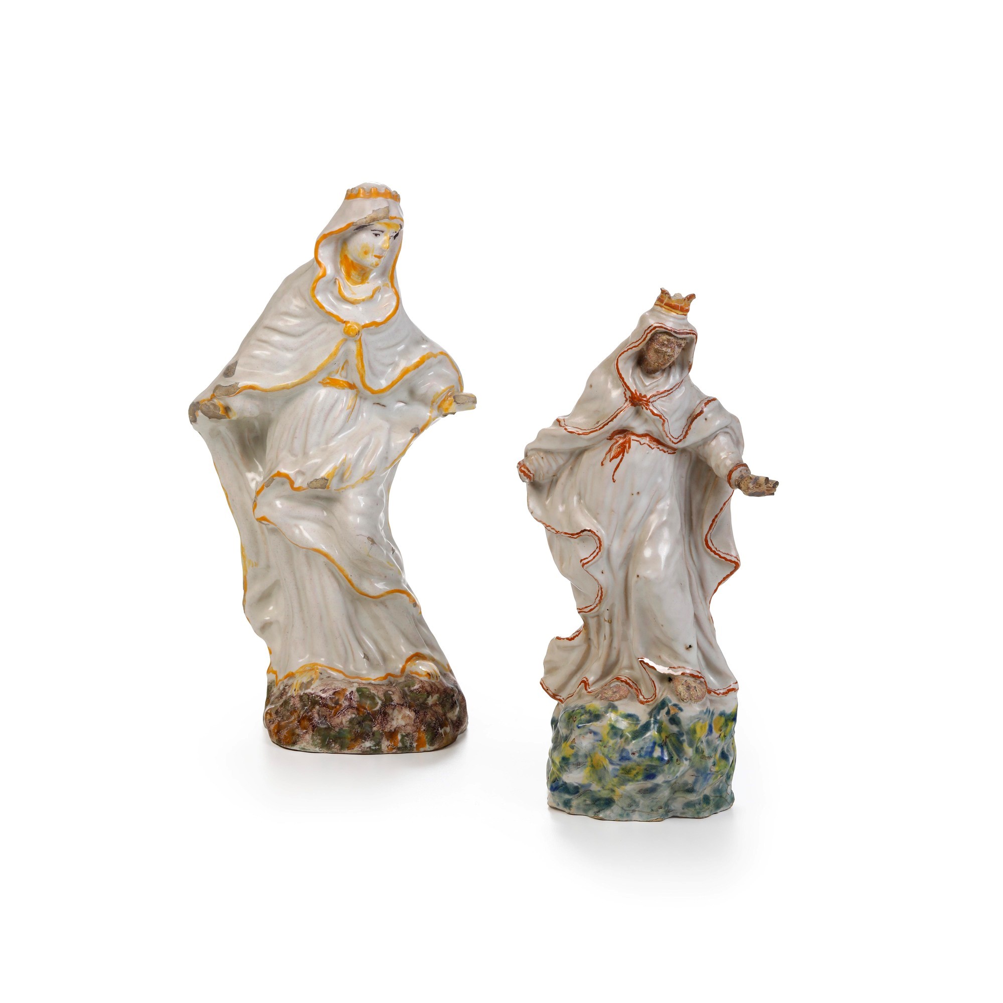 Maiolica. Marca: assente. Altezza cm 38; cm 34. Conservazione: la figura più alta con mani e corona mancanti, sbeccature e qualche salto di smalto; l’altra con parte della corona, mano destra e quattro dita della mano sinistra mancanti, sbeccature al bordo della base