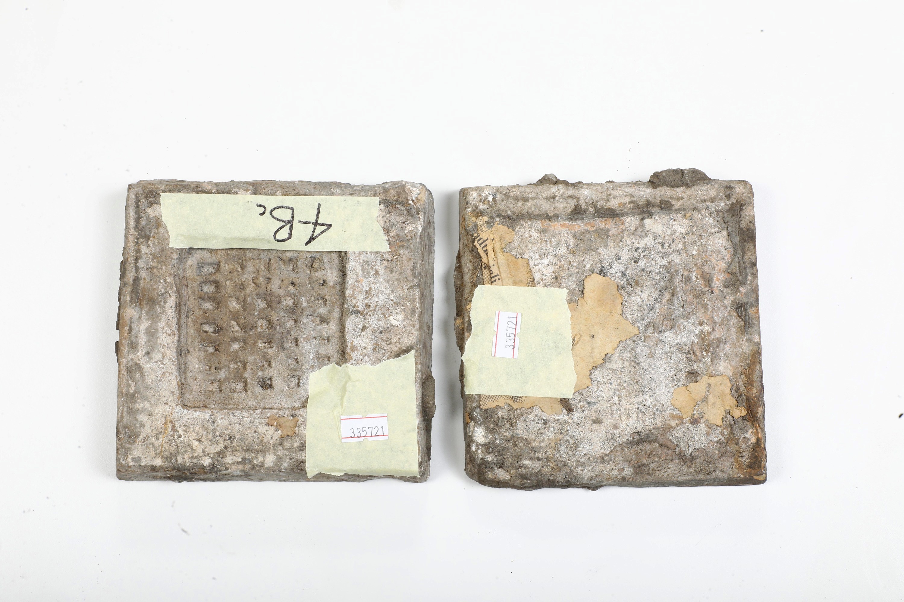 Terracotta smaltata. Dimensioni: spessore cm 2,8; cm 14,5x14,5 circa. Conservazione: buona; piccole sbeccature e cadute di smalto