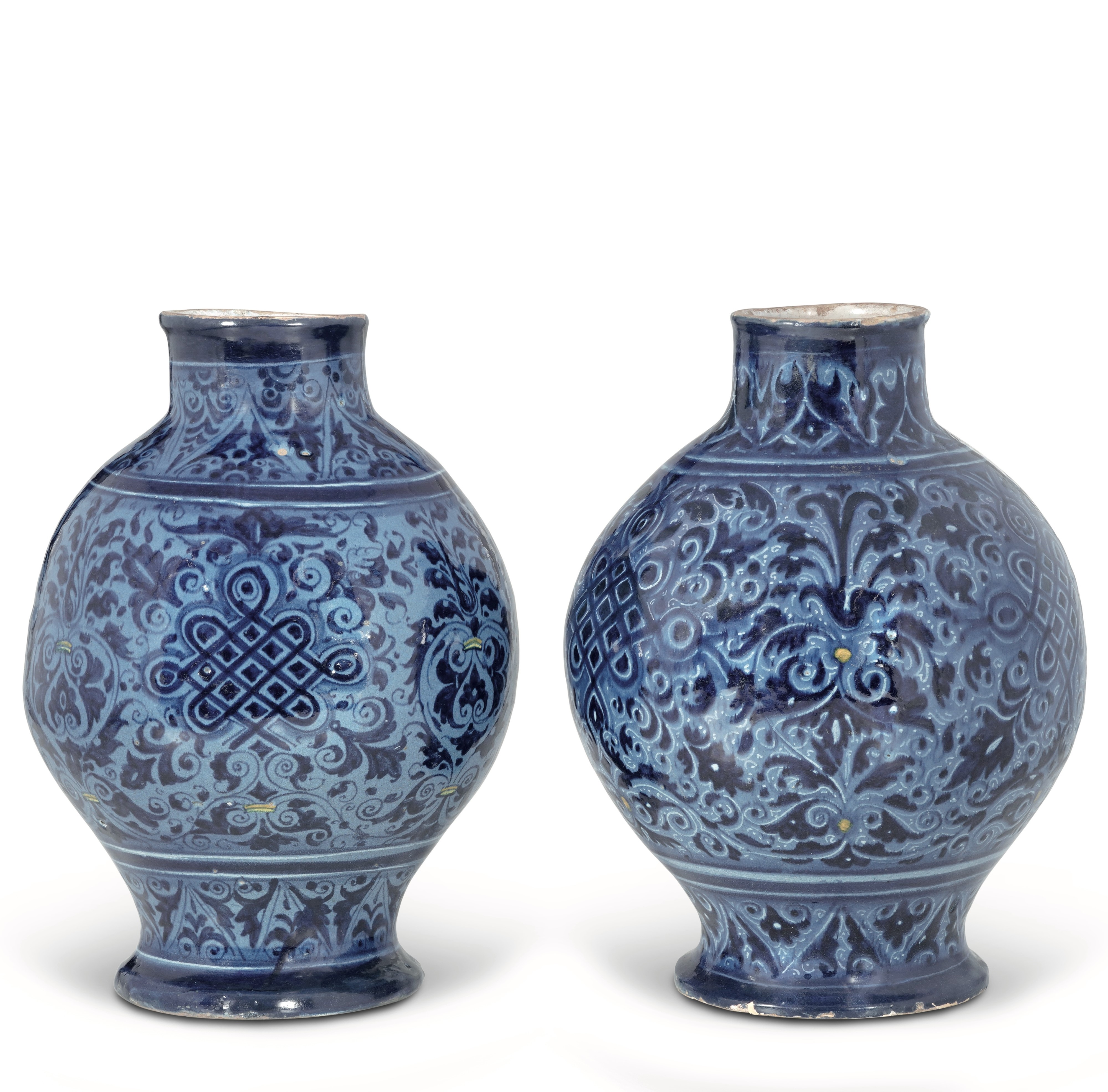 Siamo di fronte ad una rara coppia di vasi di classica forma farmaceutica, anche se l’usuale indicazione del farmaco in questo caso è assente. Essi appartengono ad un’affascinante classe di maioliche, dette nei documenti “vaghezze e gentilezze” di Faenza1: espressione che appare in una fonte del 1528 relativa a esportazioni ceramiche a Bologna. In generale per tutta la prima metà del Cinquecento tale espressione era usata per indicare una tematica vaga e gentile, appunto, che, accanto alla “grottesca”, nel corso di alcuni decenni andò elaborando un repertorio composto da “rabesche” di ispirazione orientale, girali, foglie, festoni, frutta, nodi (“groppi”), trofei, “quartieri” ecc. Tale repertorio veniva applicato ad ogni gamma possibile di forme, da quelle “aperte” (ciotole, piatti, piastrelle pavimentali ecc.) a quelle “chiuse” (boccali, vasi globulari, albarelli, fiasche ecc.). Non meno interessante si mostra la qualità tecnica di queste due “bocce”, che in generale connota la tipologia cui appartengono. Lo smalto infatti può assumere tutte le gamme possibili di azzurro, più o meno intenso, fino al blu lapislazzulo, raggiungendo esiti di grado molto sofisticato. Nel caso in esame, inoltre, la “vaghezza” è frutto della combinazione di “rabesche”, di matrice orientale, a “groppi” derivati dai cosiddetti “nodi vinciani”, largamente impiegati nel Rinascimento per la decorazione di ricami, tessuti, cuoi, armi o gioielli. L’attribuzione a Faenza è sostenuta da numerosi reperti e scarti di lavorazione, comprendenti anche frammenti in “biscotto”, provenienti da siti urbani2